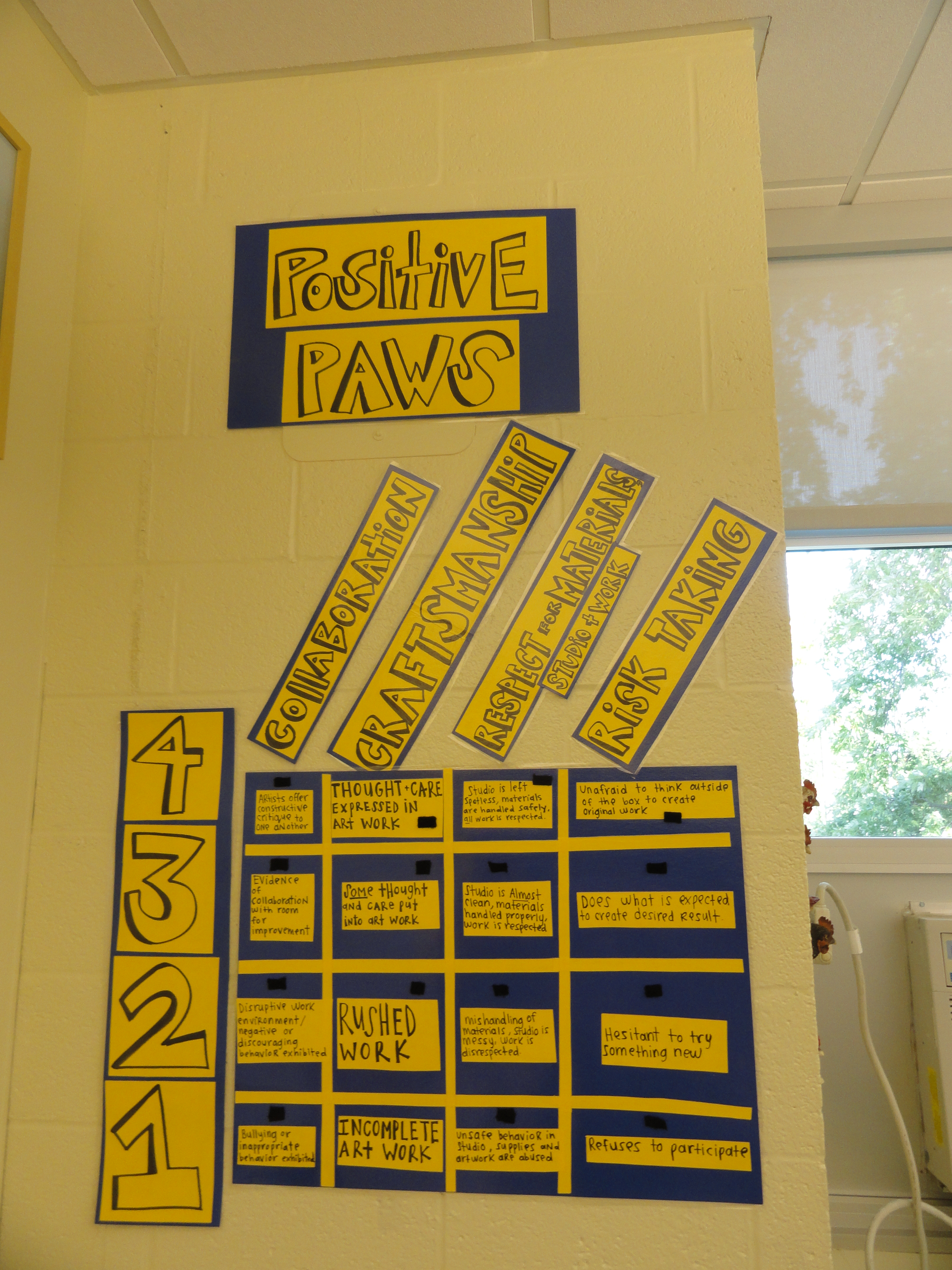 Ask your child to tell you about Positive Paws, the new behavior management plan being implemented by all special subject classes this year. In the art studio we are focused on receiving 4s in all categories: Collaboration, Craftsmanship, Respect for Materials, Studio and Work, and lastly, Risk Taking. Students vote on their performance at the end of each day. The class that earns perfect 4s in all special subject classes for one week will be publicly recognized for their success.