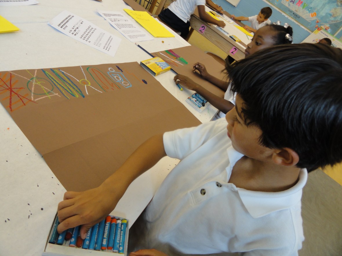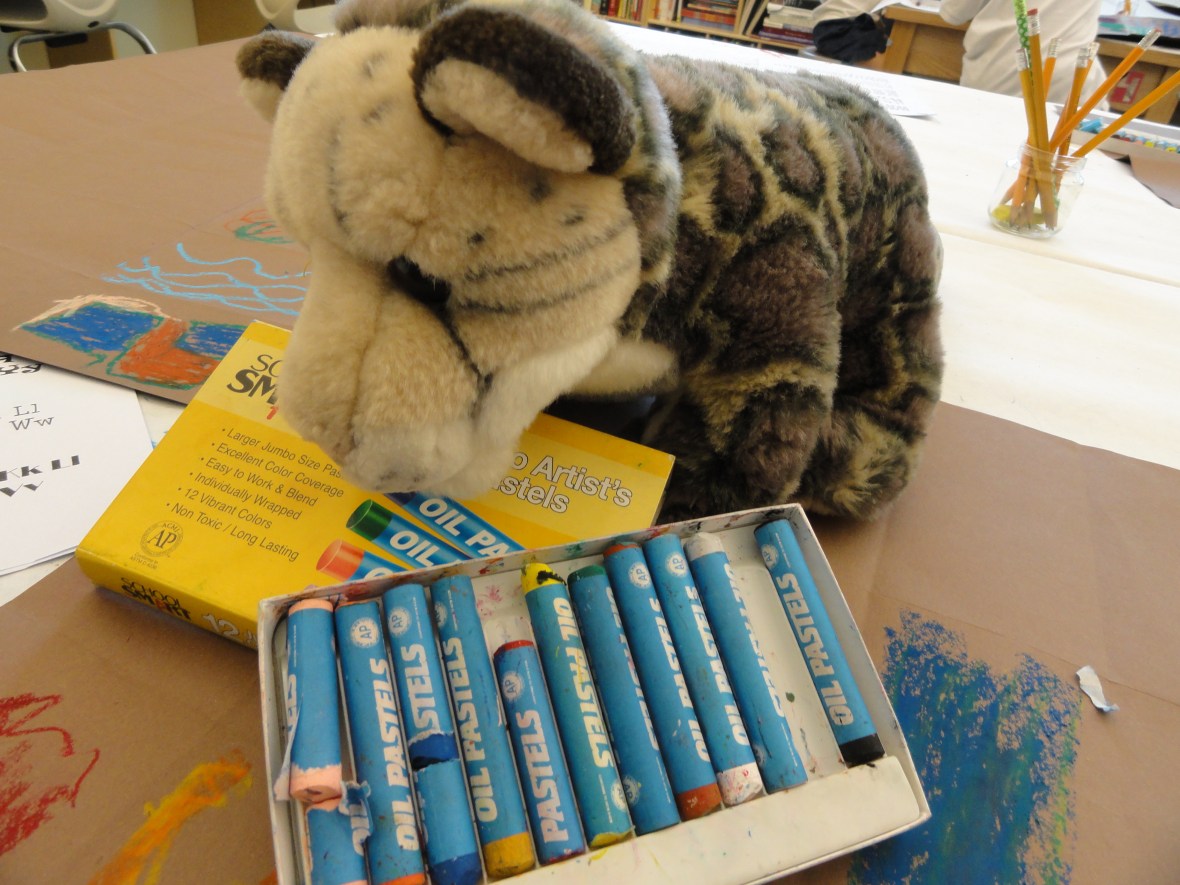 Demonstrating what to do when our oil pastels run low: Peel away the paper, toss it in the trash, and carry on. We also learned not to get bent out of shape when our pastels break in half. It happens all the time and is the sure sign of an artist hard at work.