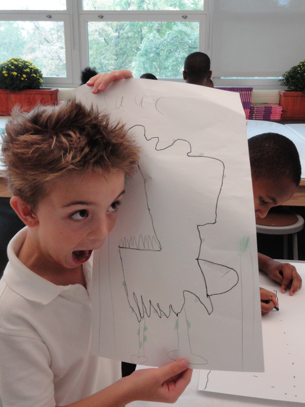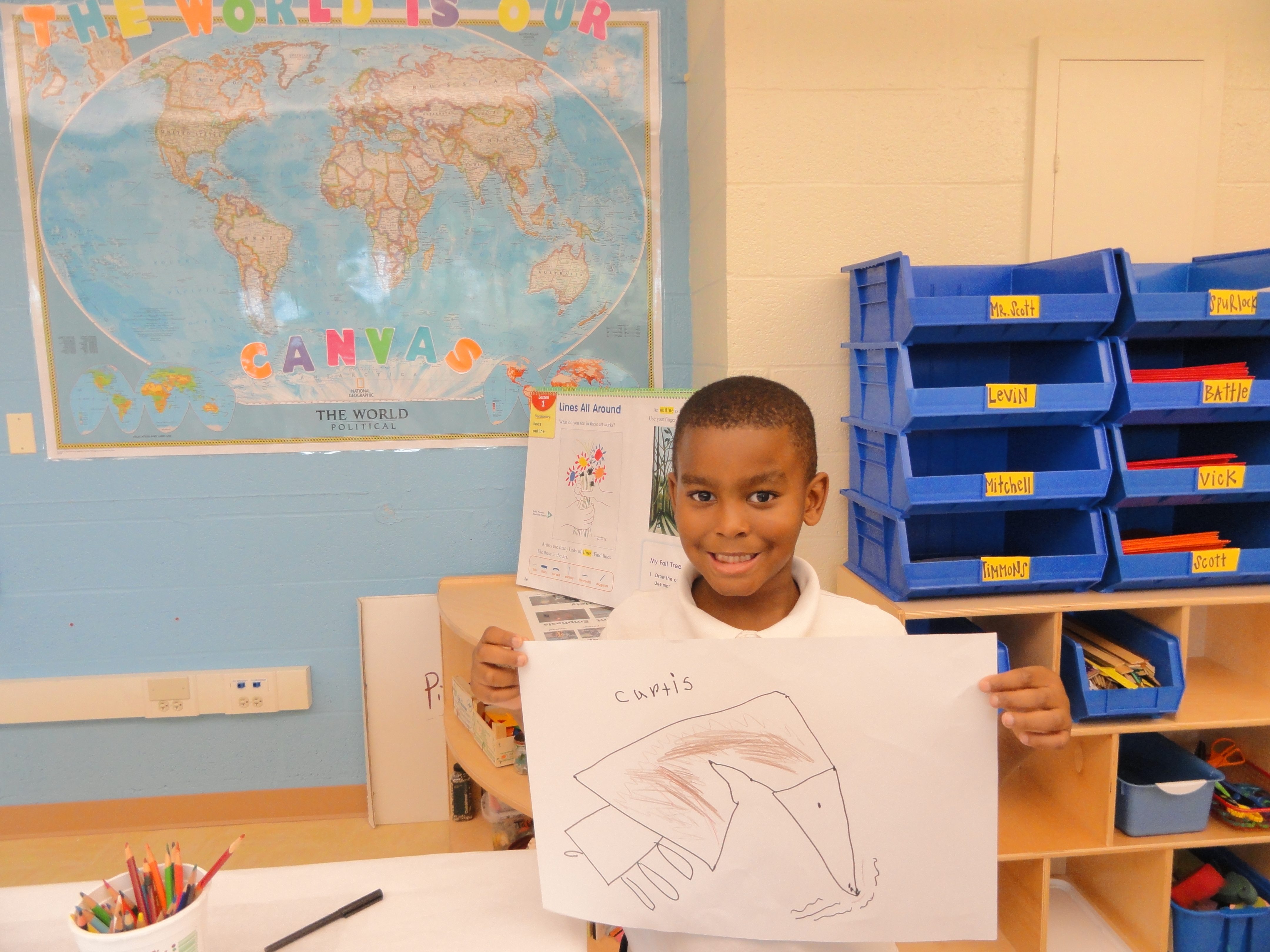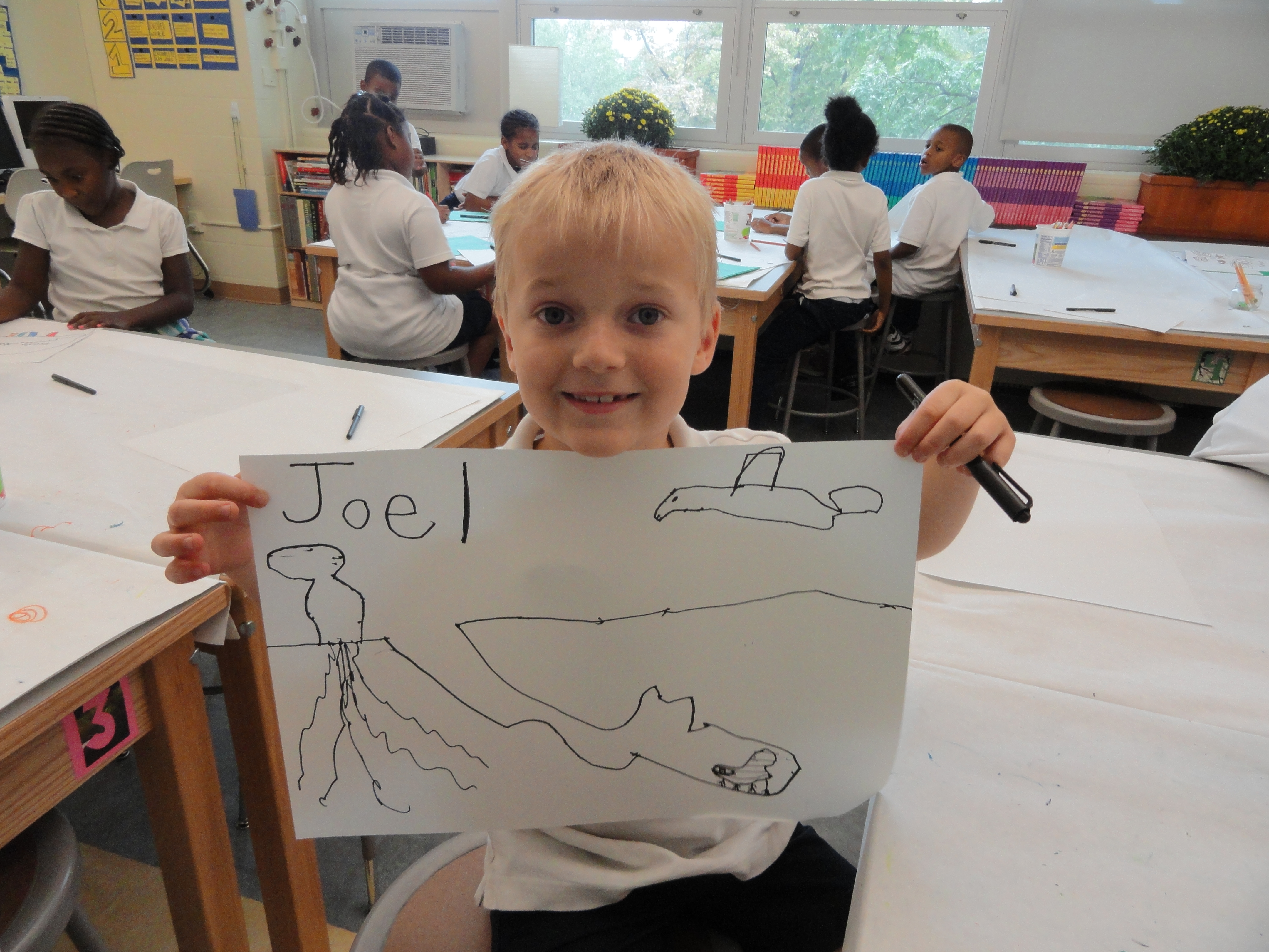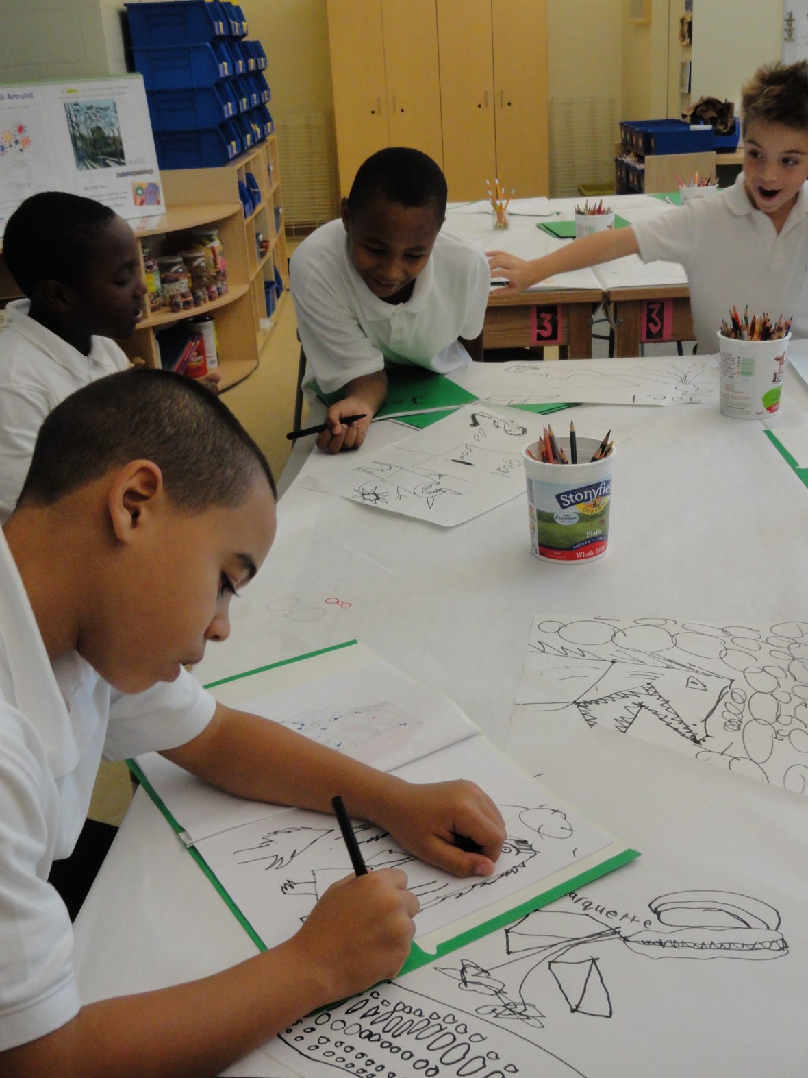 Imagine closing your eyes, gripping a marker, and blindly placing 10 dots randomly on your canvas. Next, you open your eyes and are tasked with connecting those dots to create a fictional creature using both organic and geometric line segments. Turning dots on a page into imaginative characters is what the 3rd graders have been hard at work doing. After a bit of practice, their creations have surpassed my wildest expectations. One student, for instance, thought outside of the box and instead of using his 10 blind dots to create his creature, used them to design a habitat for his creature instead! It’s independent thinking and risk taking like that that turns you from art student to artist in seconds.