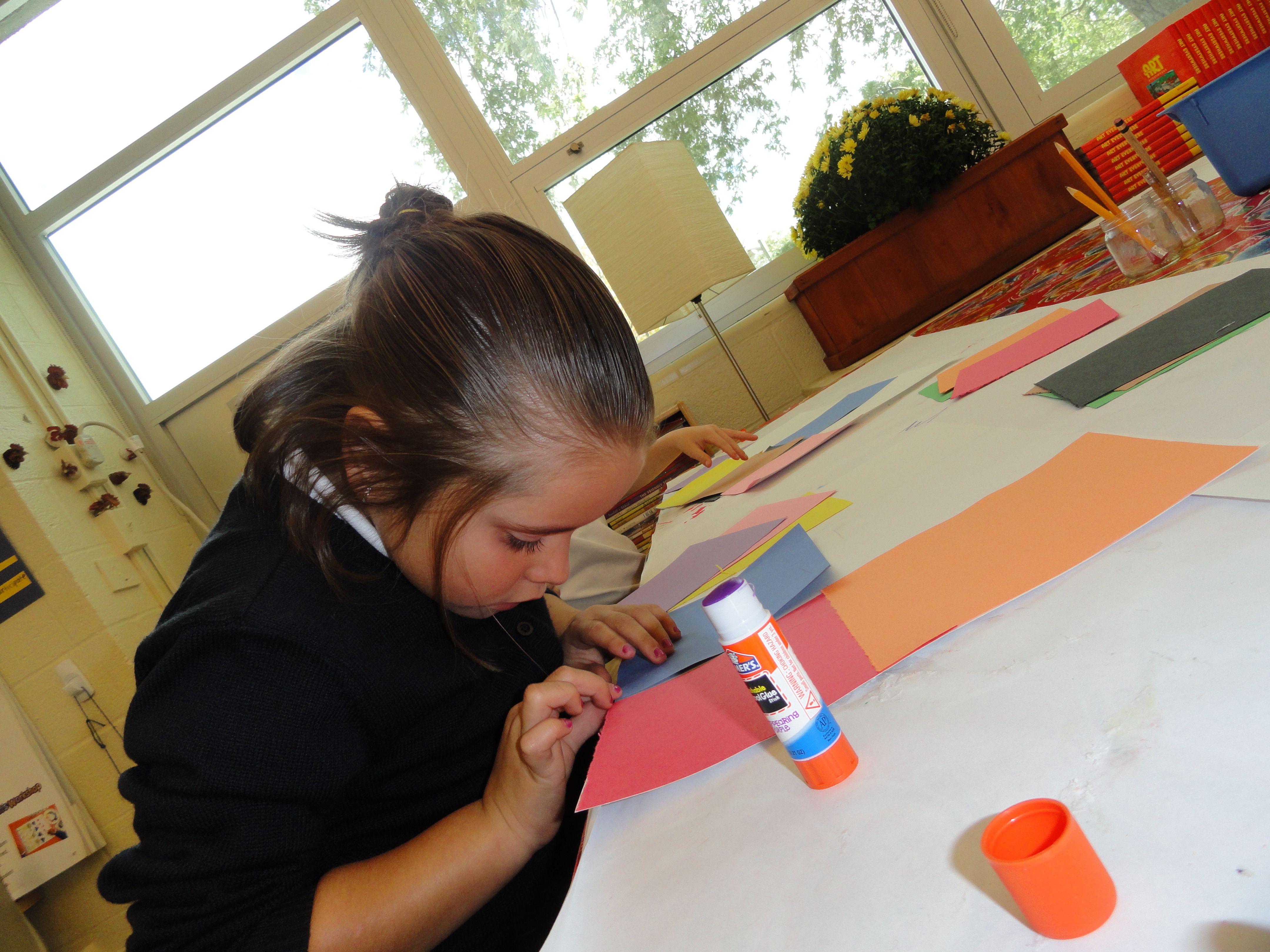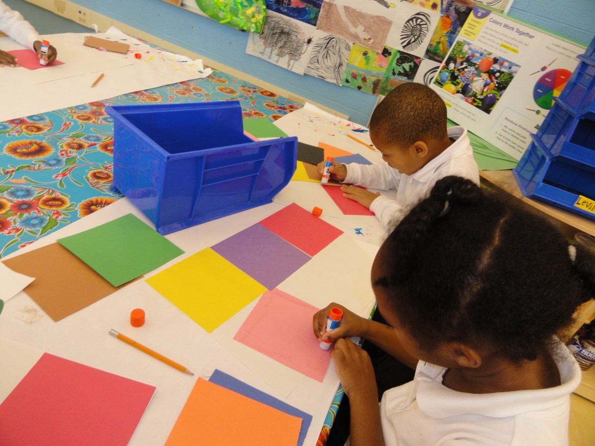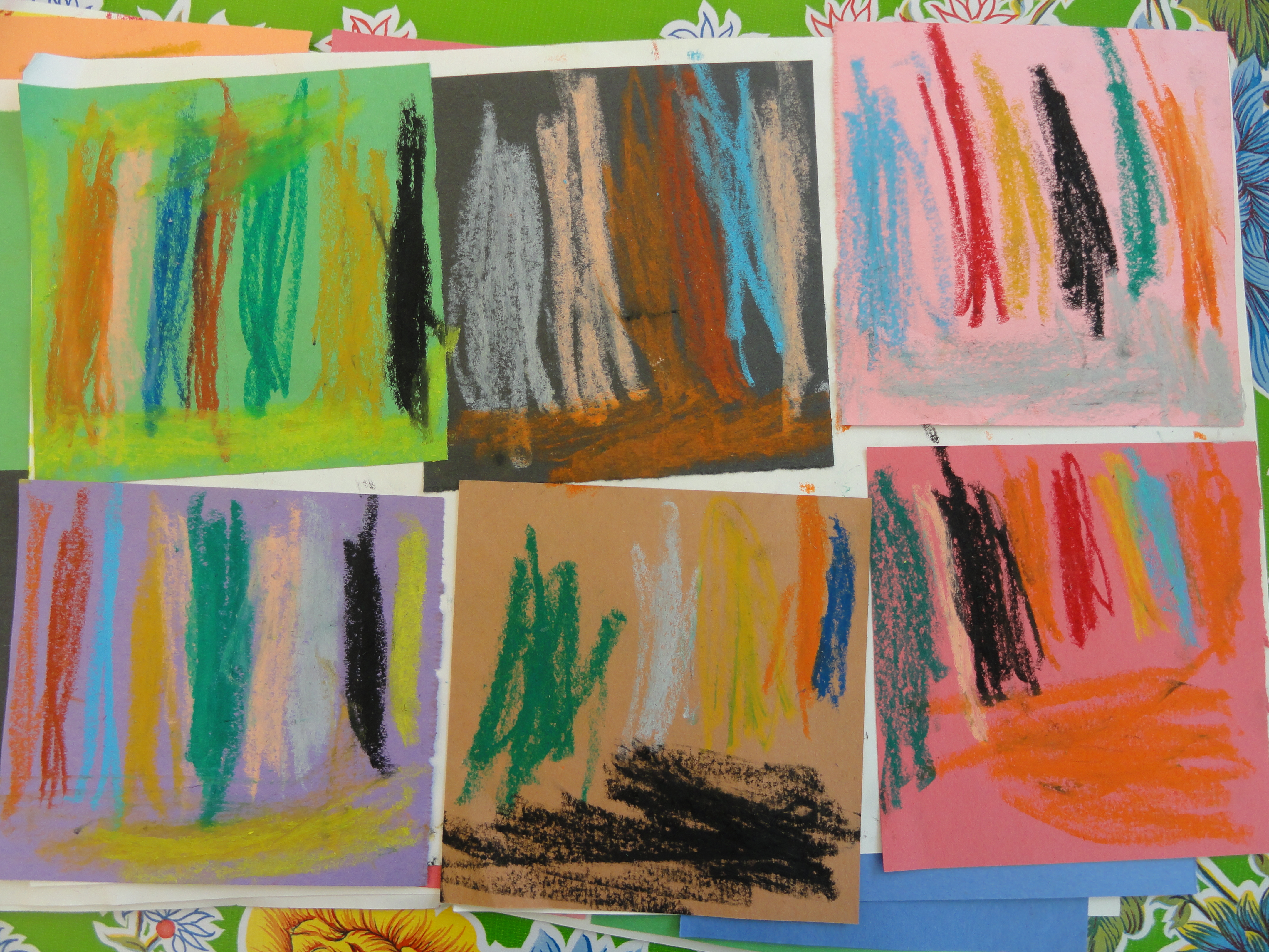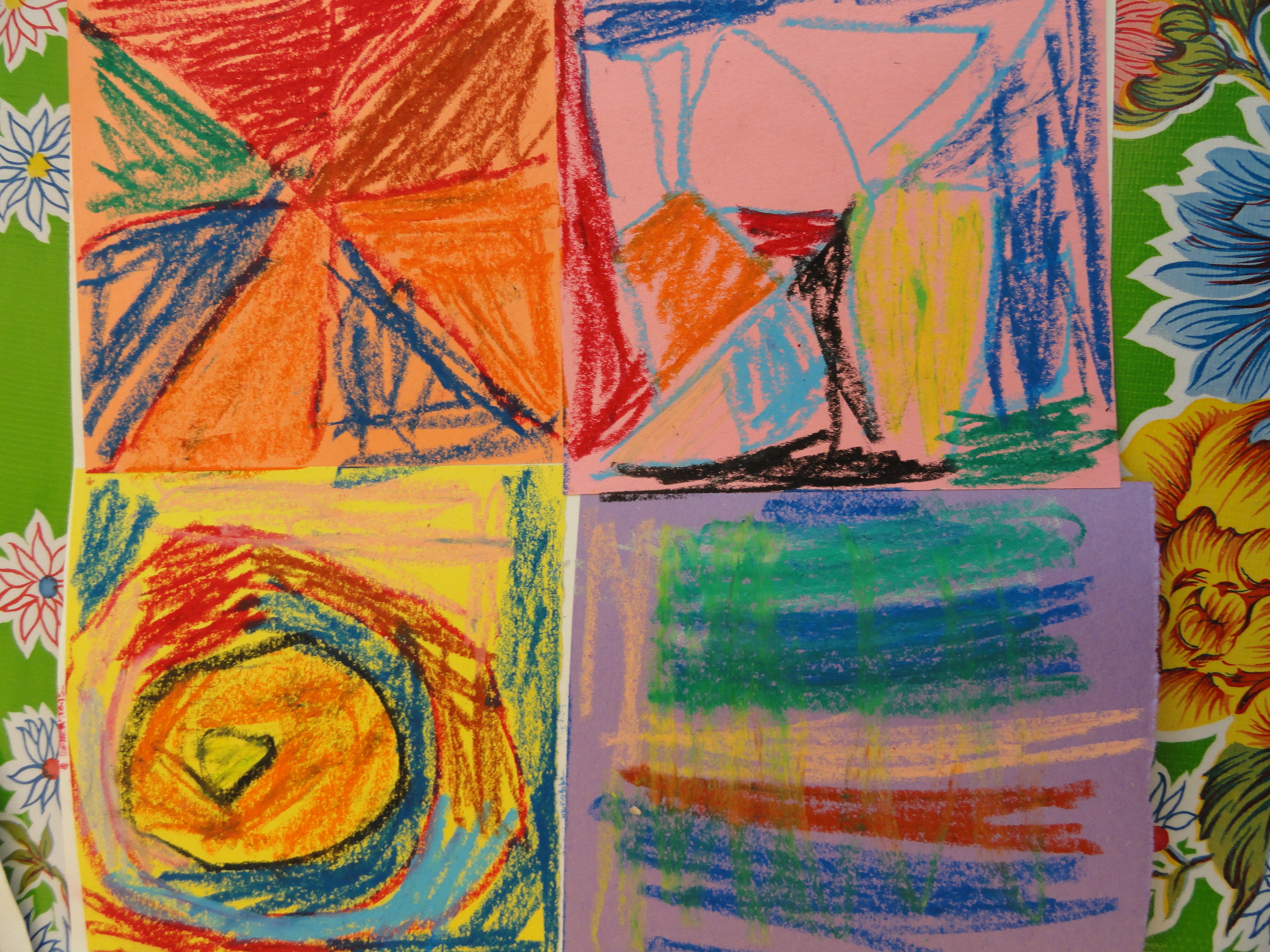 Kindergarten is working on the background design for their Kandinsky collages. As Owen observed, they are “smearing” the backgrounds with oil pastels to created the same blurred background that Kandinsky shows in his work.