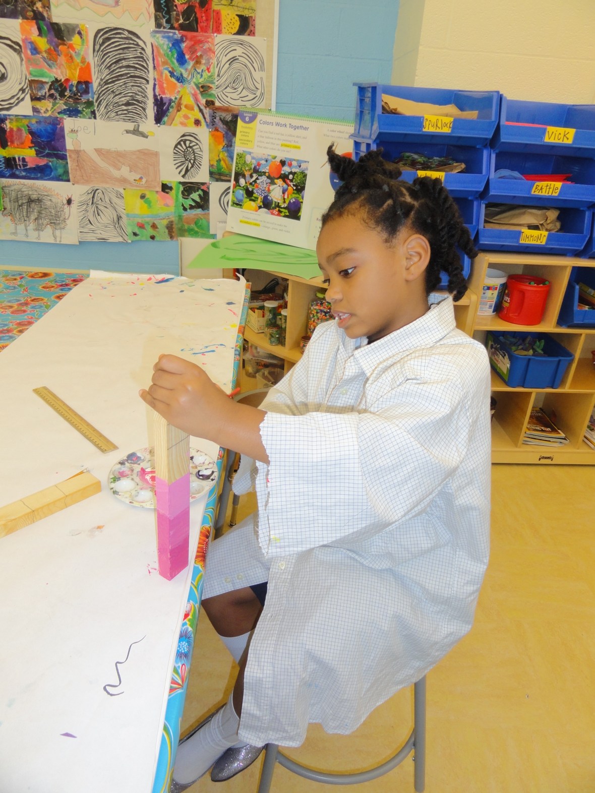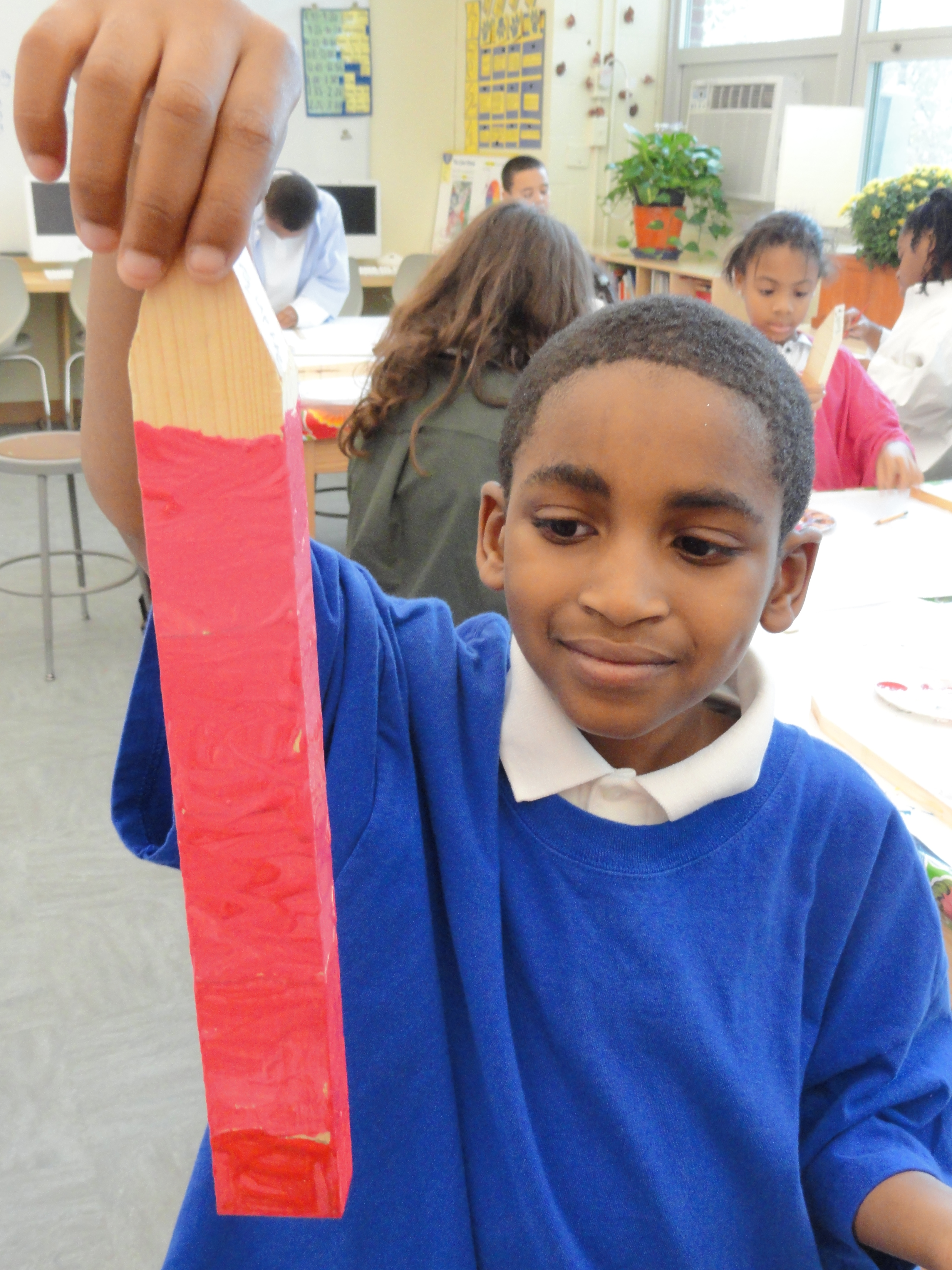 This student is sporting a dashing, over-sized, blue smock donated by a generous Maury parent. I bet his mom is thanking you right now. So am I!