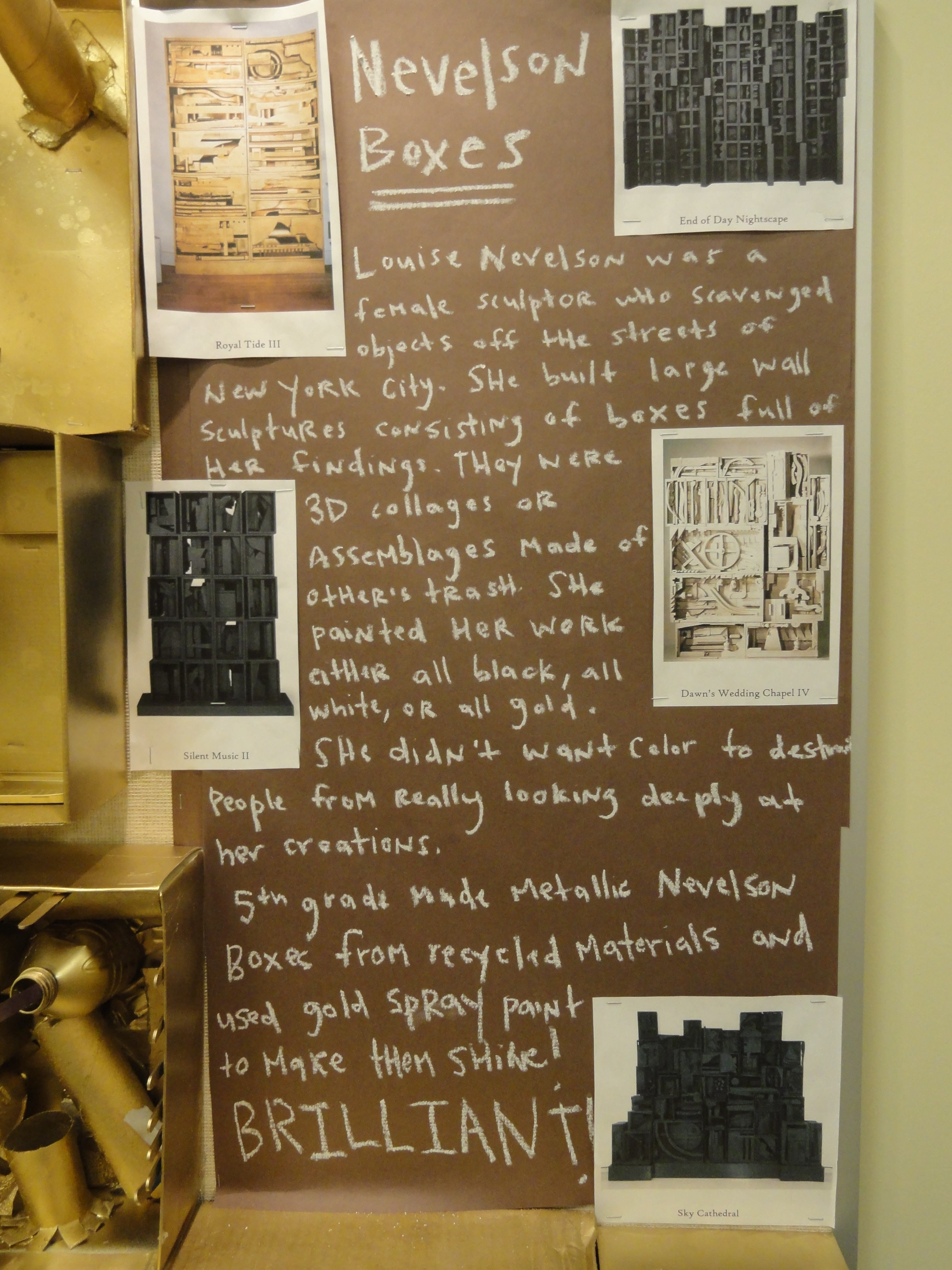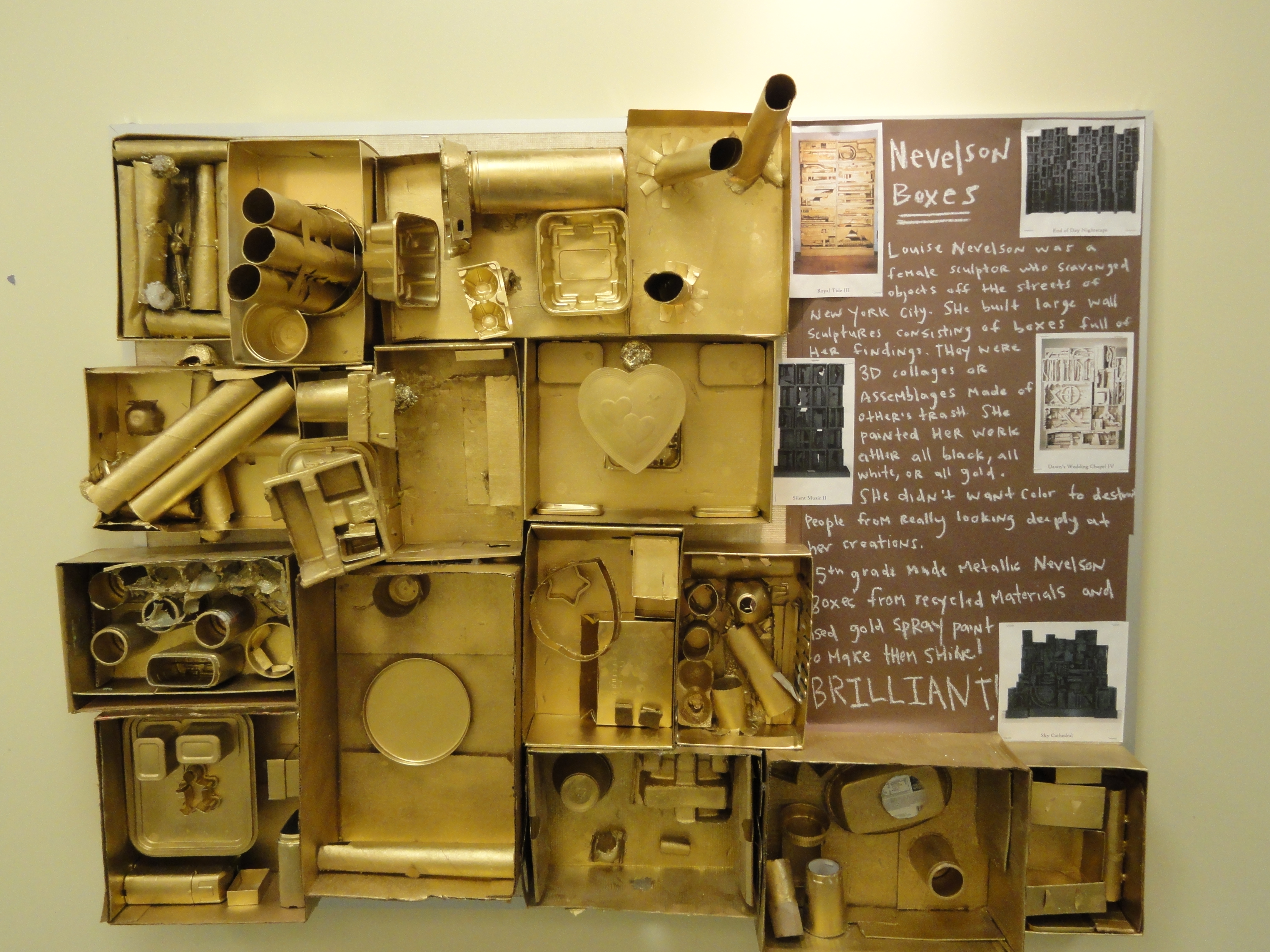 5th Grade: Heavy Metal Heroes! January 7, 2012January 6, 2012 • studiomaury Our Nevelson Boxes are dazzling the hall between the East and West wing. So proud of these 3D masterpieces. Truly as trash to treasure transformation! Share this: Click to share on X (Opens in new window) X Click to share on Facebook (Opens in new window) Facebook Like Loading... Related