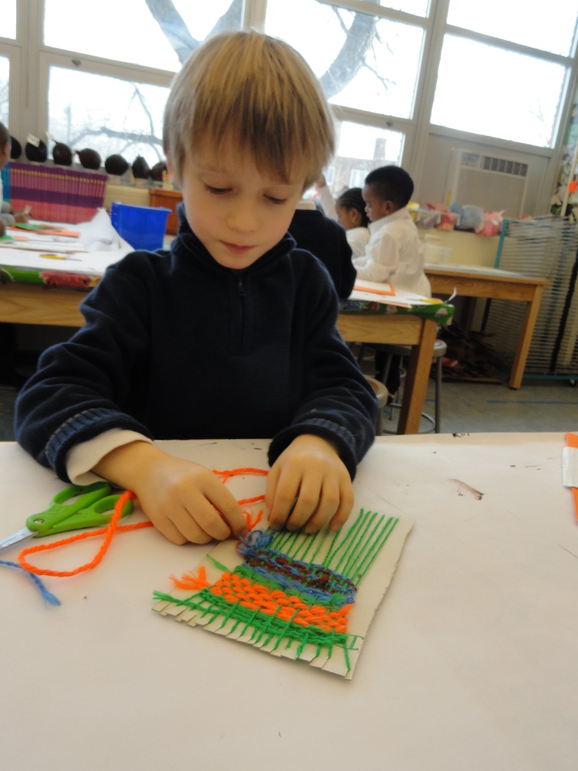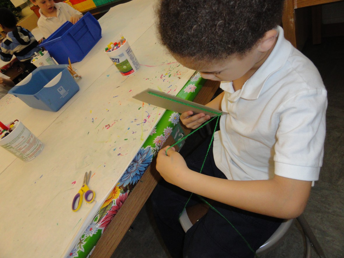 Students created their very own looms from old cereal boxes. They cut “teeth” into the cardboard and “flossed” the warp yarn into the grooves.