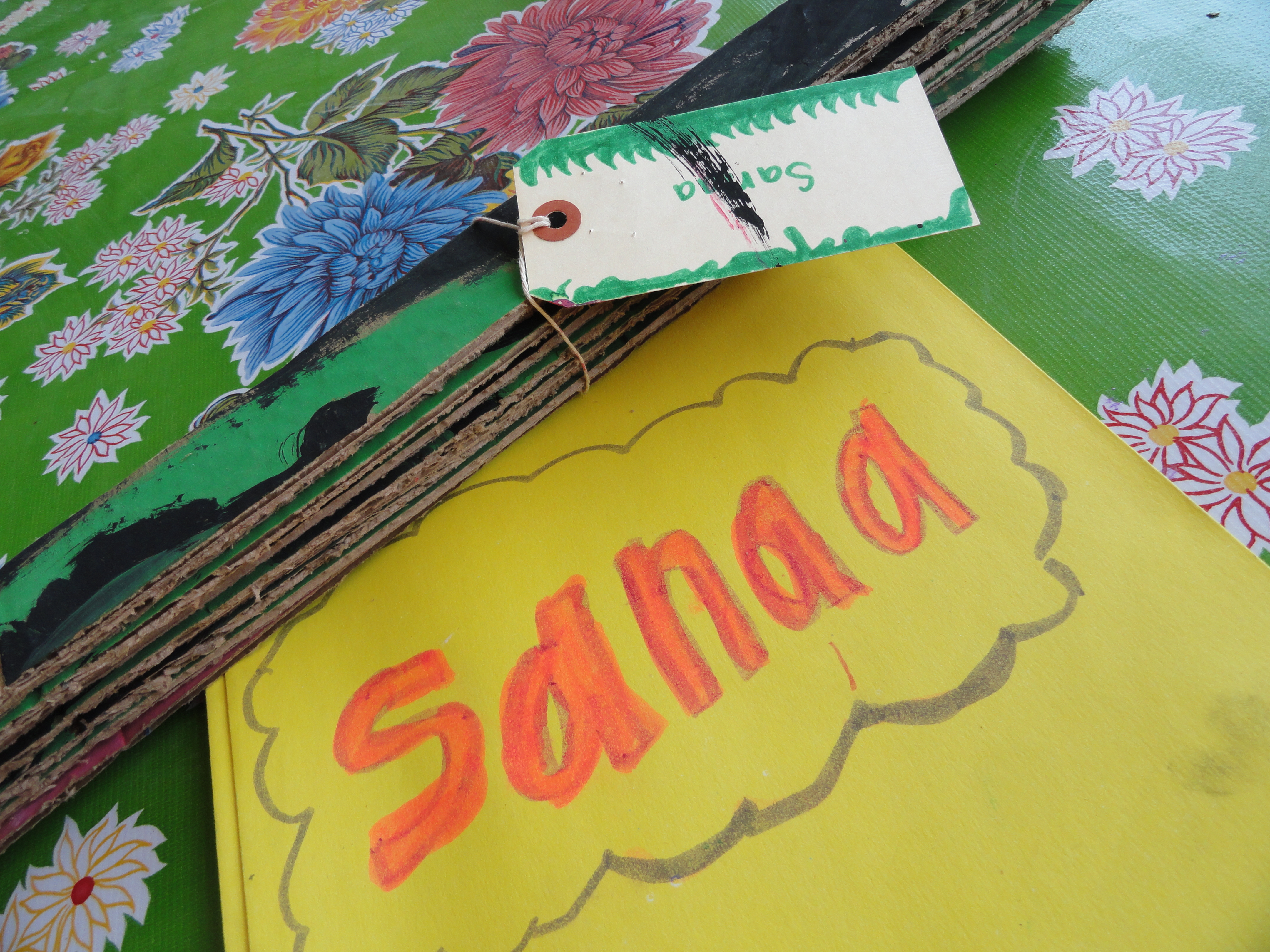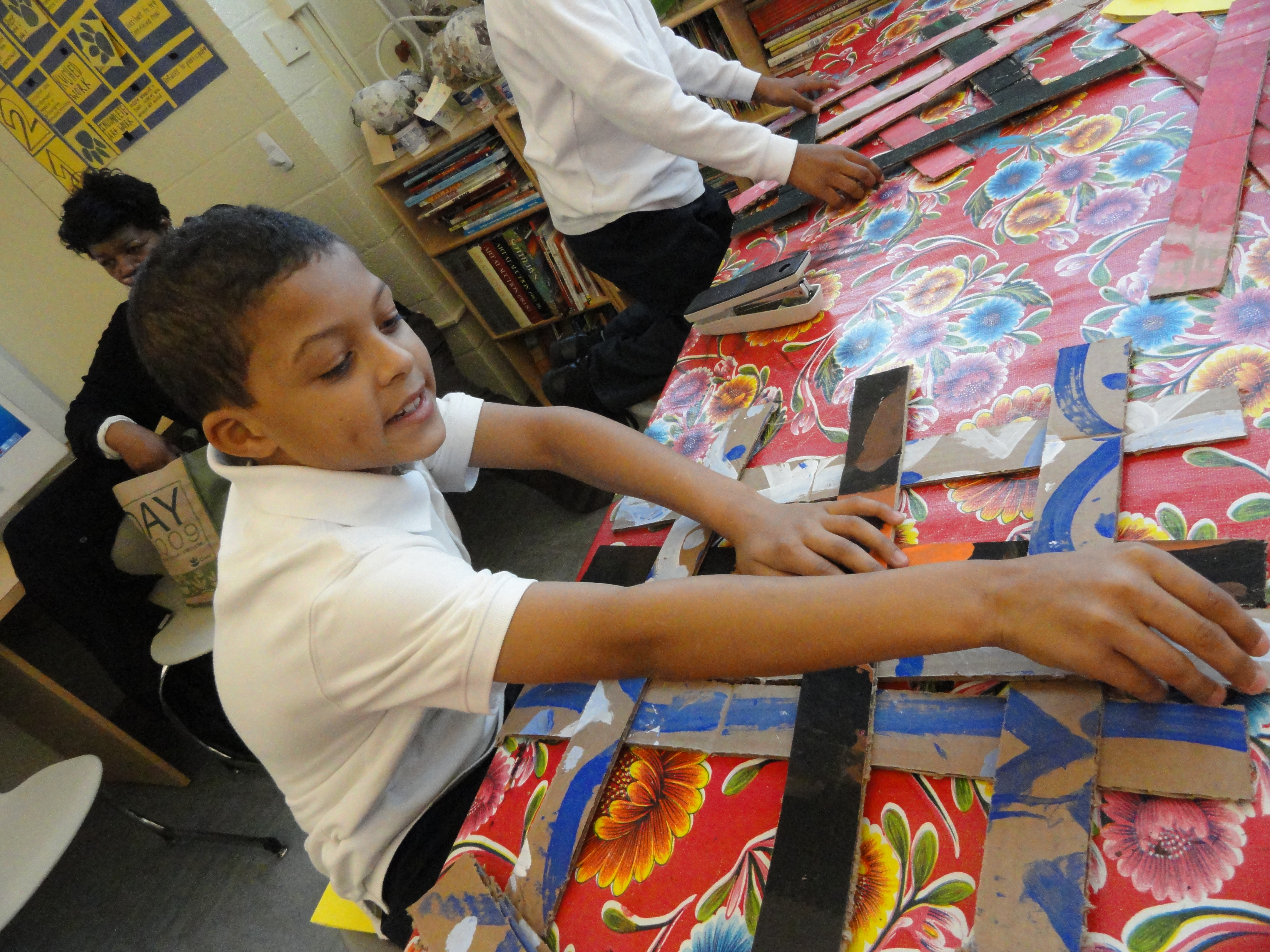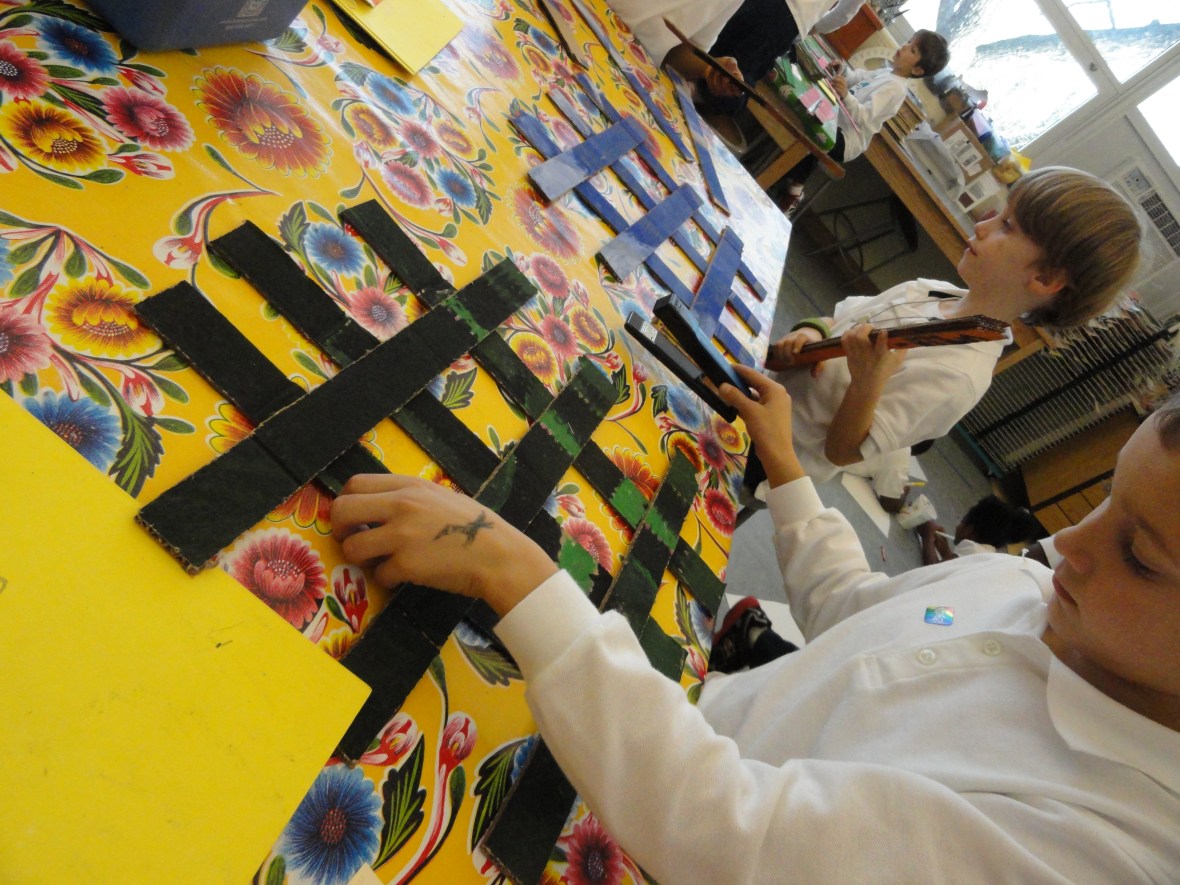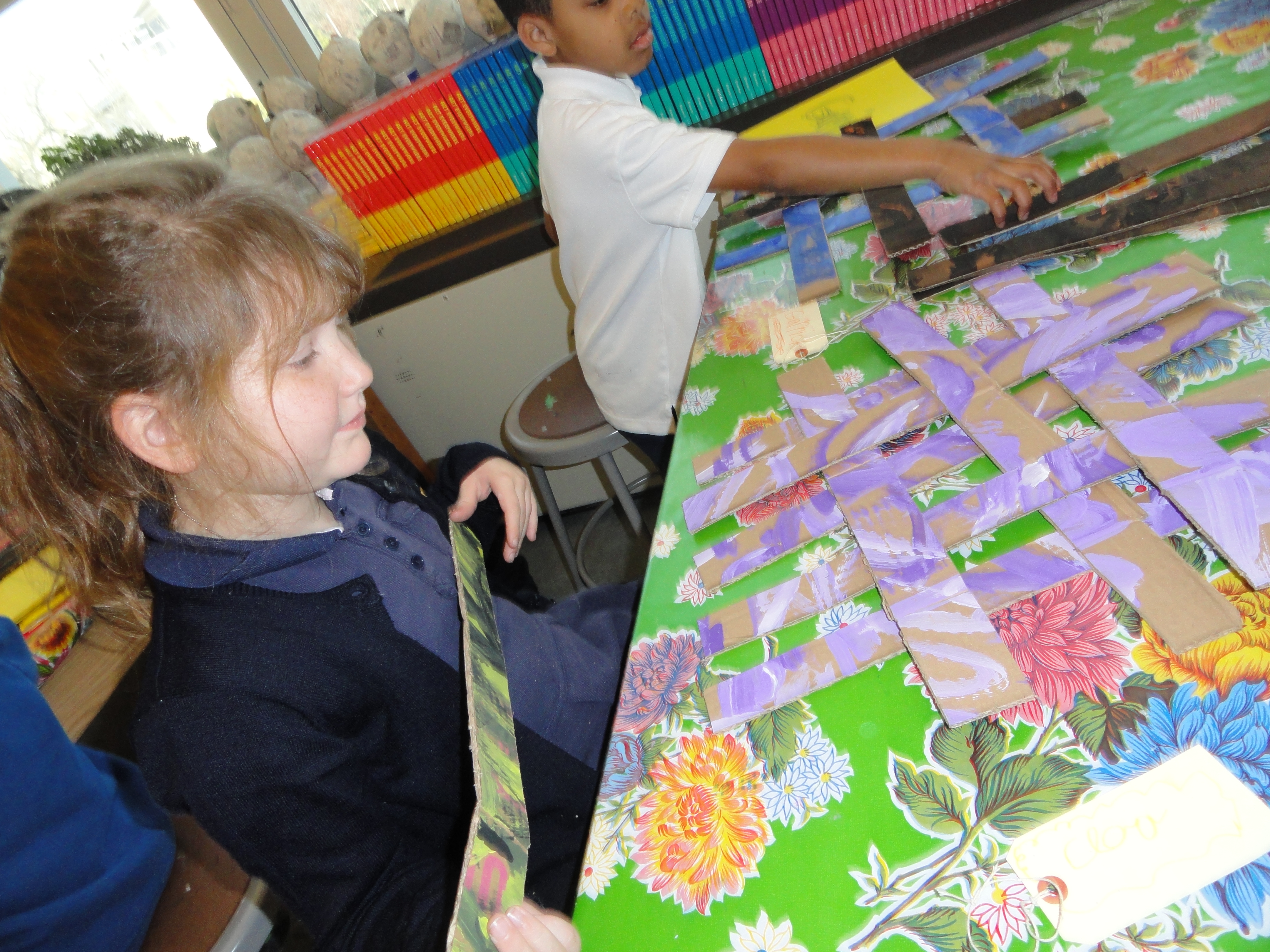 After the tinted and shaded complementary colors had dried, I spent some quality time with a box cutter, slashing old Frito boxes into weaving strips. These 10 strips would serve as puzzle pieces for our second grade weavers.