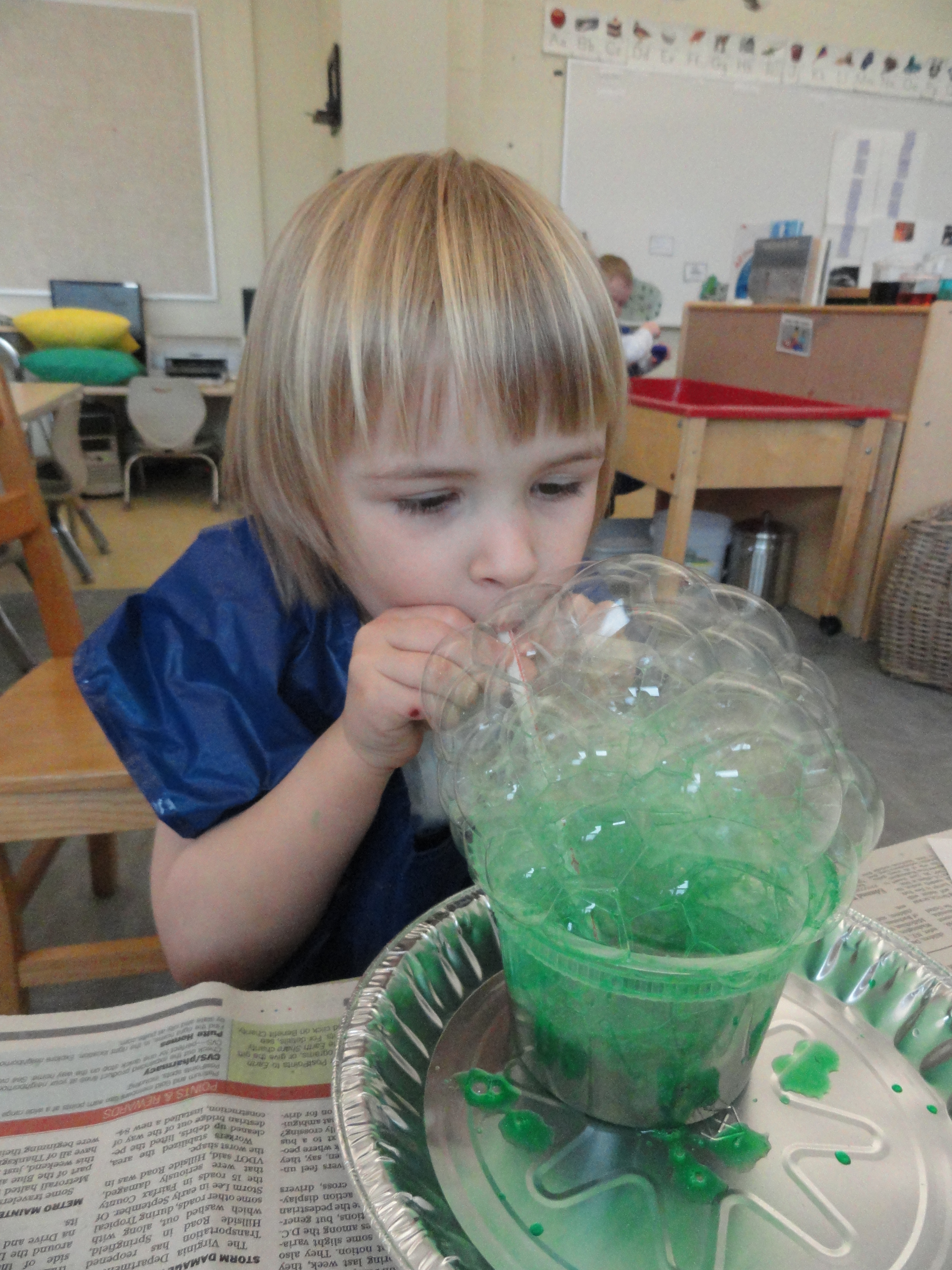 Students started by practicing making bubbles with a straw. A mixture of water and food coloring helped us perfect our technique. It was important that we got the hang of blowing OUT instead of IN. A stained mouth resulted if the later happened.