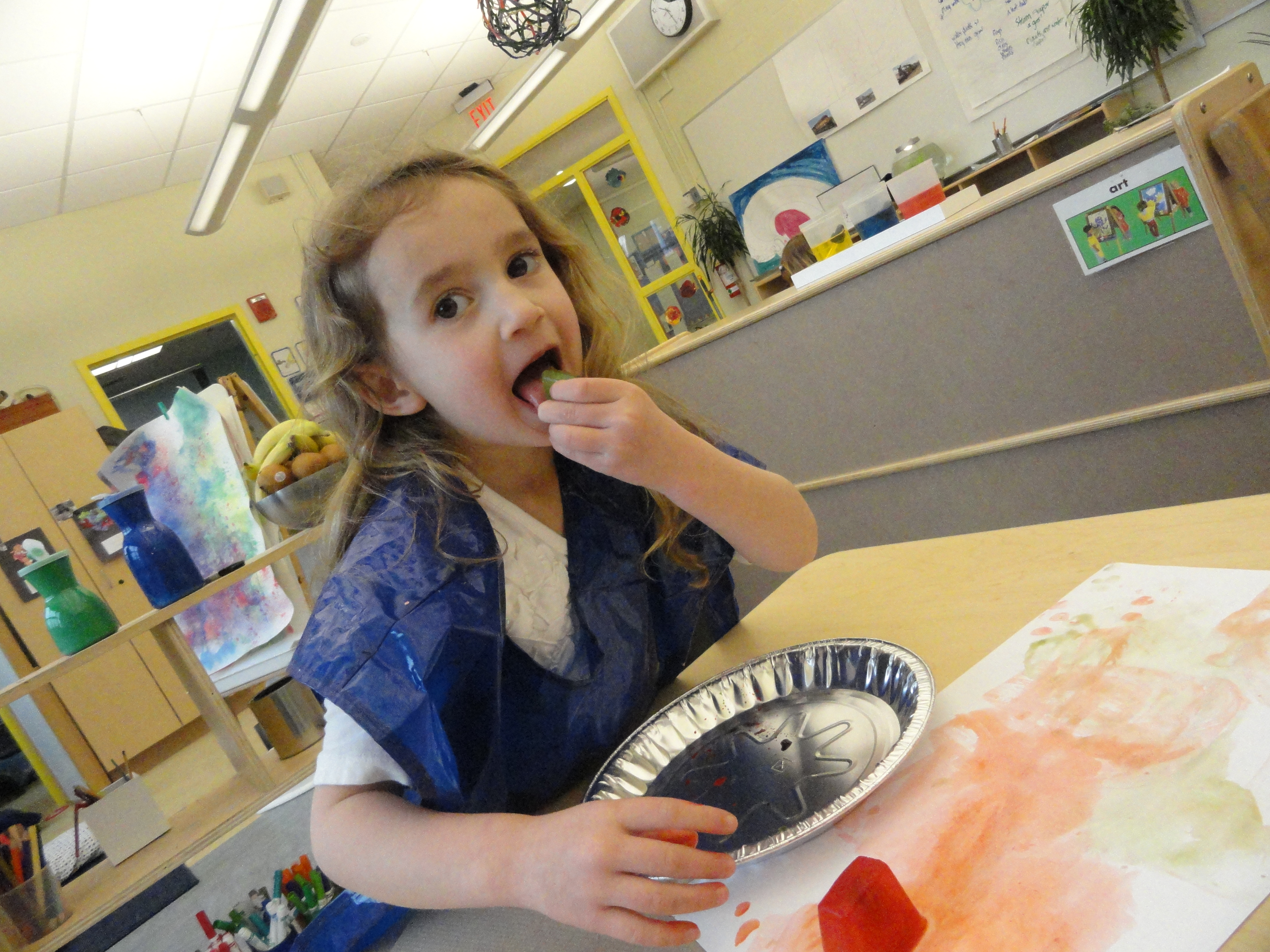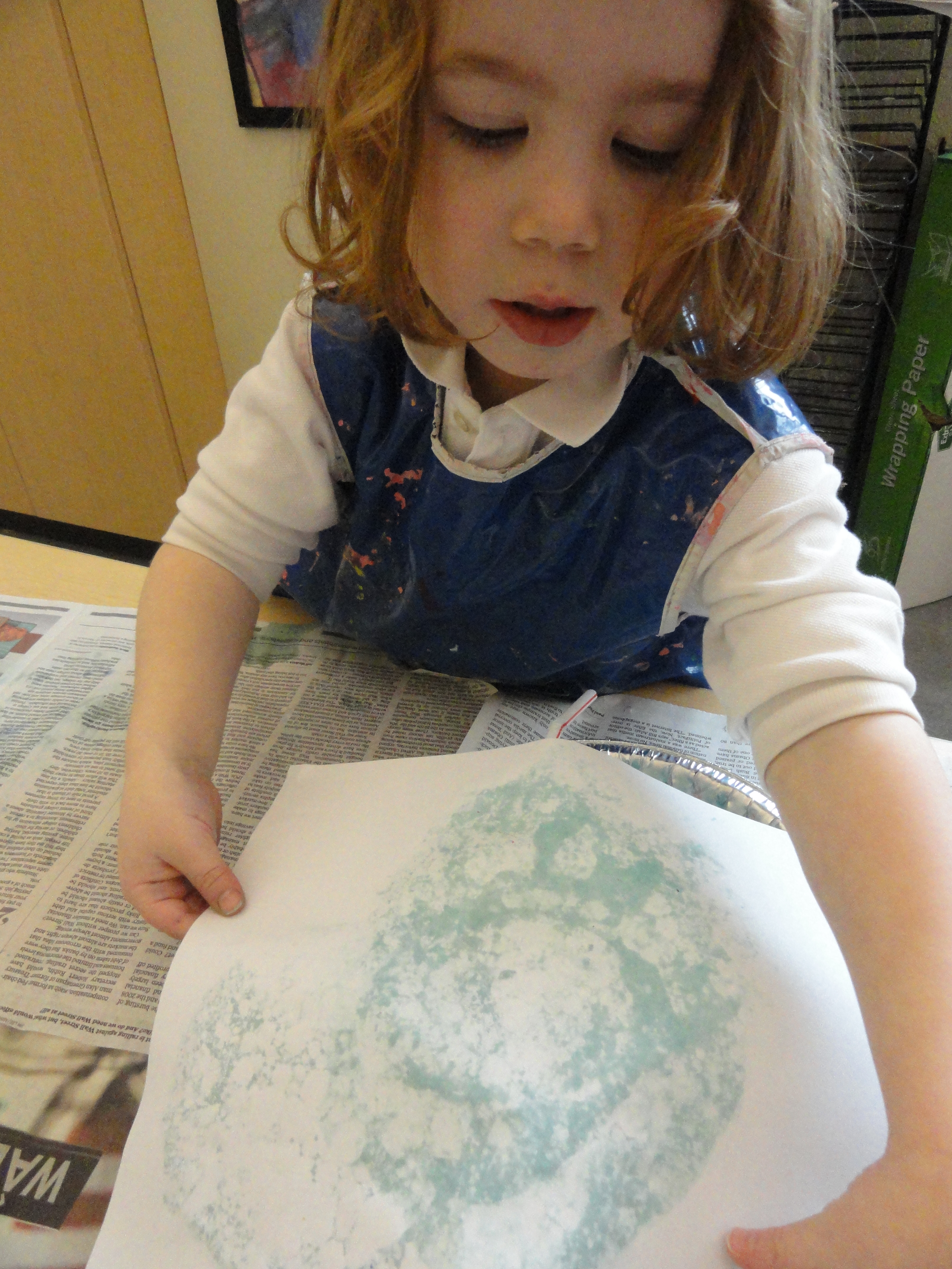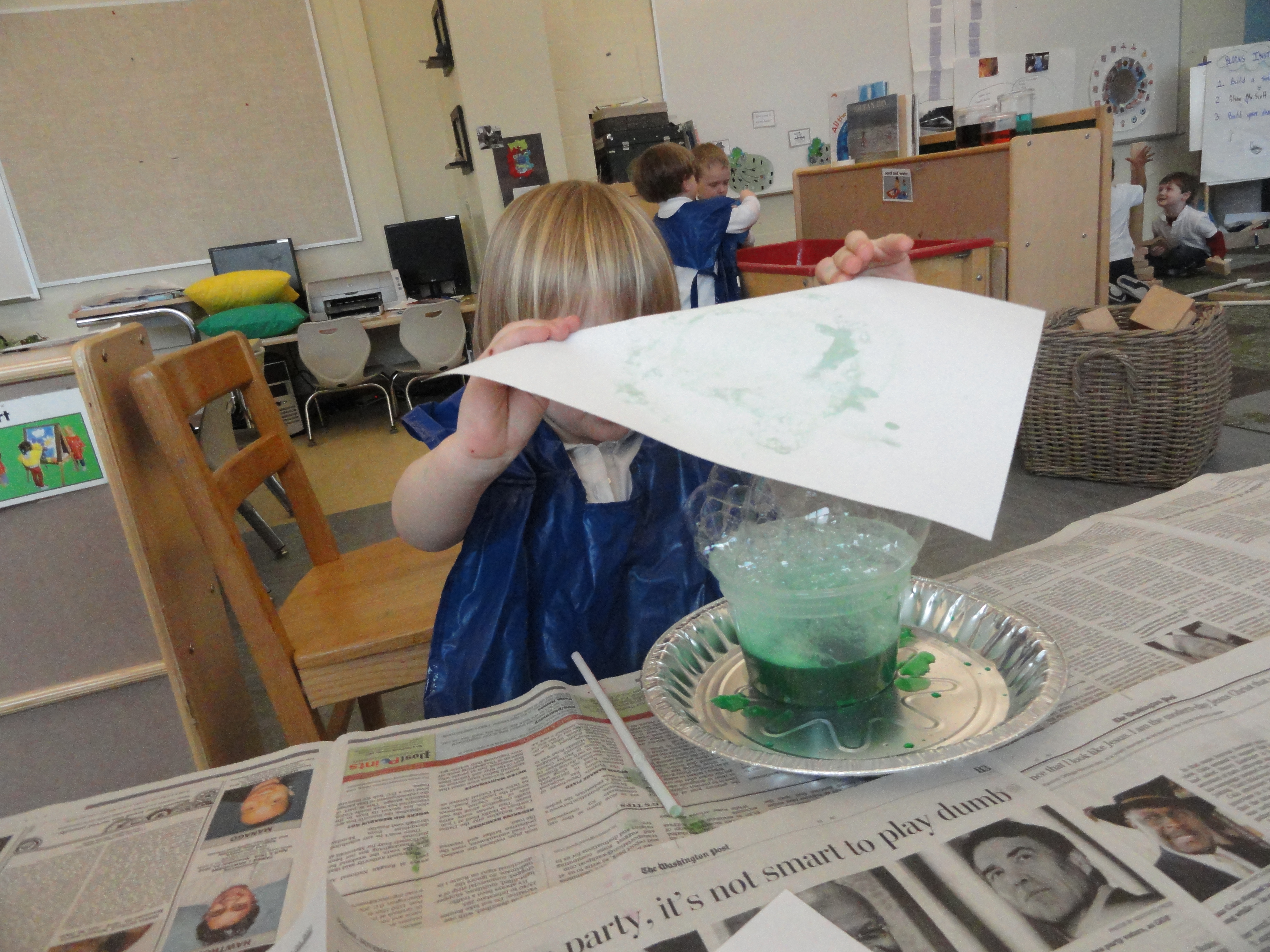 How does the water come into play? In the studio, our water unit has taken us from bubbles to ice to Kool-aid. Preschool and PreK are making handmade paper to fashion into a book that will remind us of all the different water-inspired creative processes we’ve used along the way. The first kind of paper we made was bubble print paper.