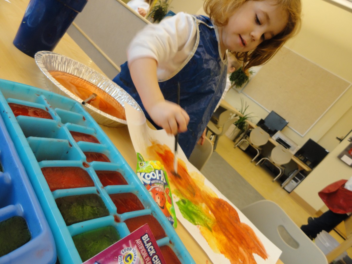 Then we talked about what happens to water when it freezes. I dyed ice cubes with Kool-aid to create ice cube brushes. We painted with these cold tools and created a watercolor wash. We also experimented to see what would happen when we poured Kool-aid powder, in its solid state, directly onto the paper and then added water. The results were very different.