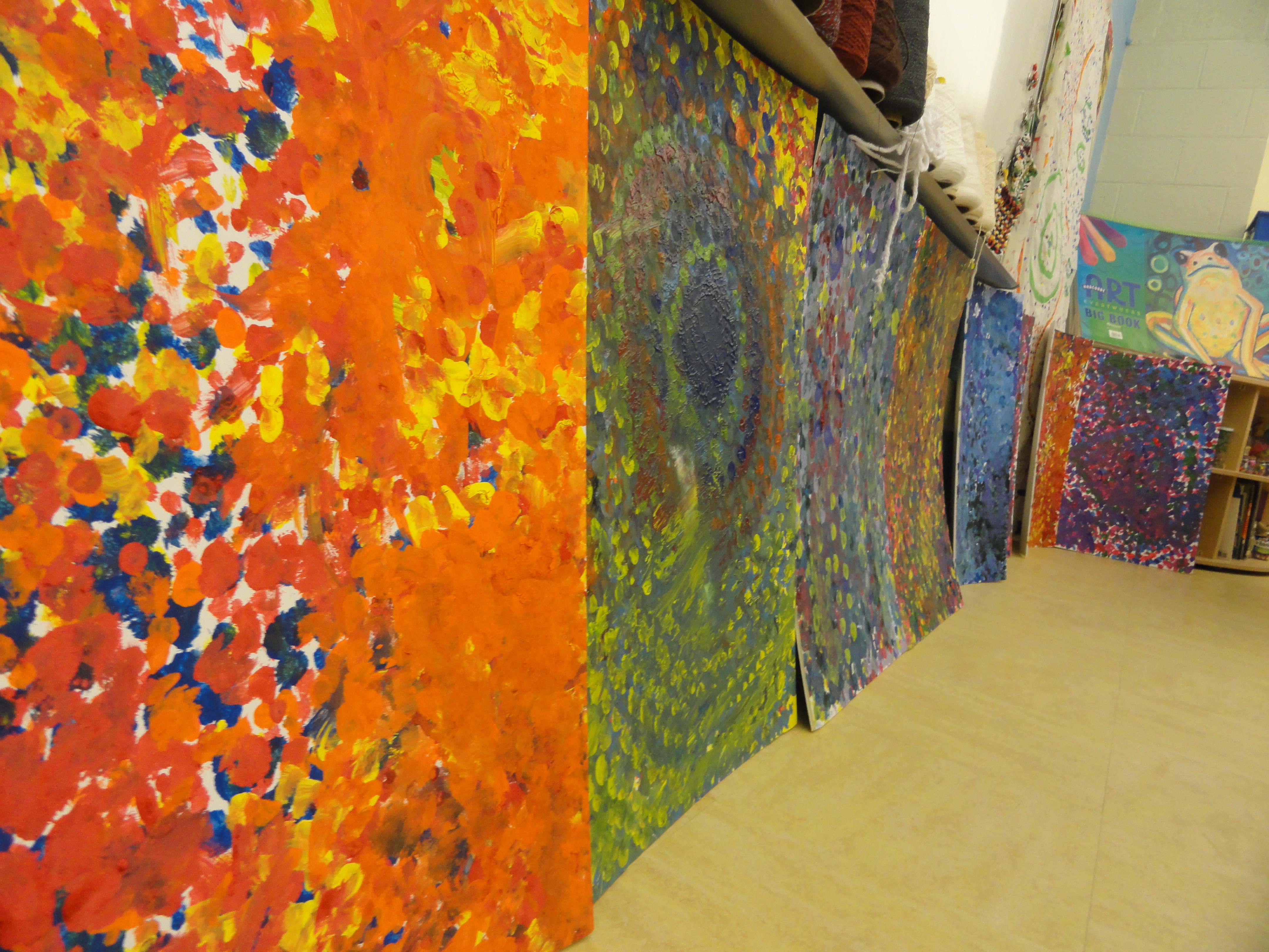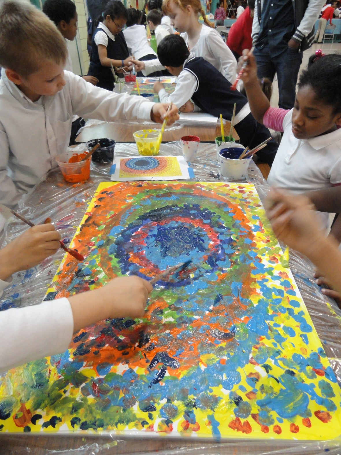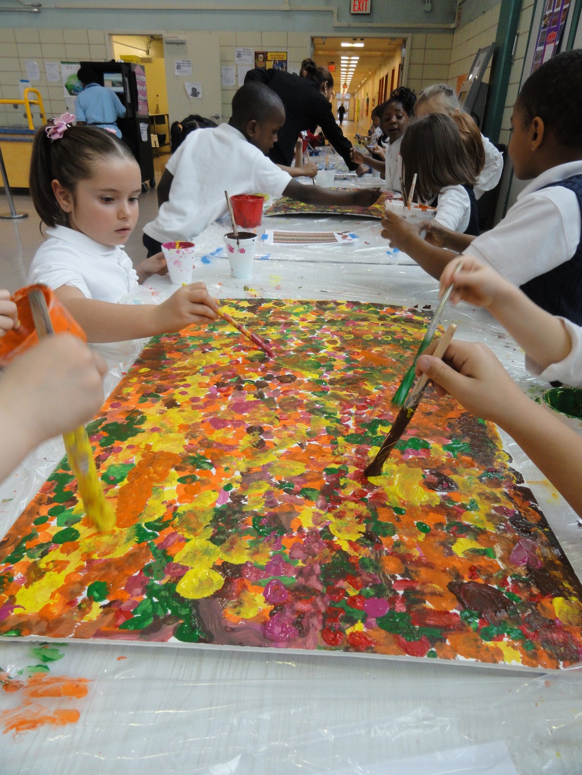 Our little Alma Thomas apprentices hard at work. Students from the preschool and PreK classes worked in collaboration to reinterpret Alma’s New Galaxy painting.