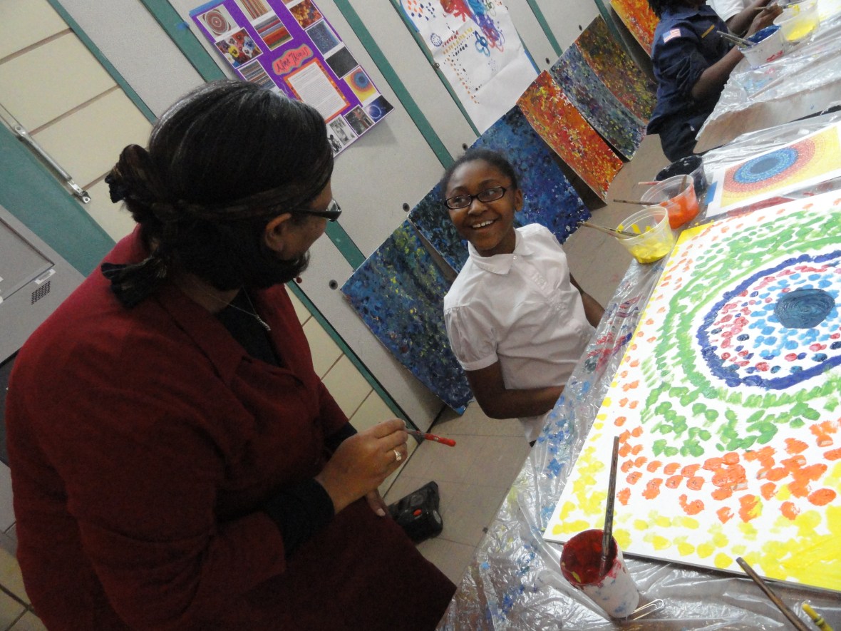 Kindergarten teacher, Ms. Battle, the chair of our Black History Month Committee, shares a moment with a former student and current 4th grader. It was so exciting to witness students and staff sharing knowledge and interacting with one another in such a meaningful new way. I was particularly pleased to see teachers and staff members taking the time to add their creative marks on our school-wide art pieces.
