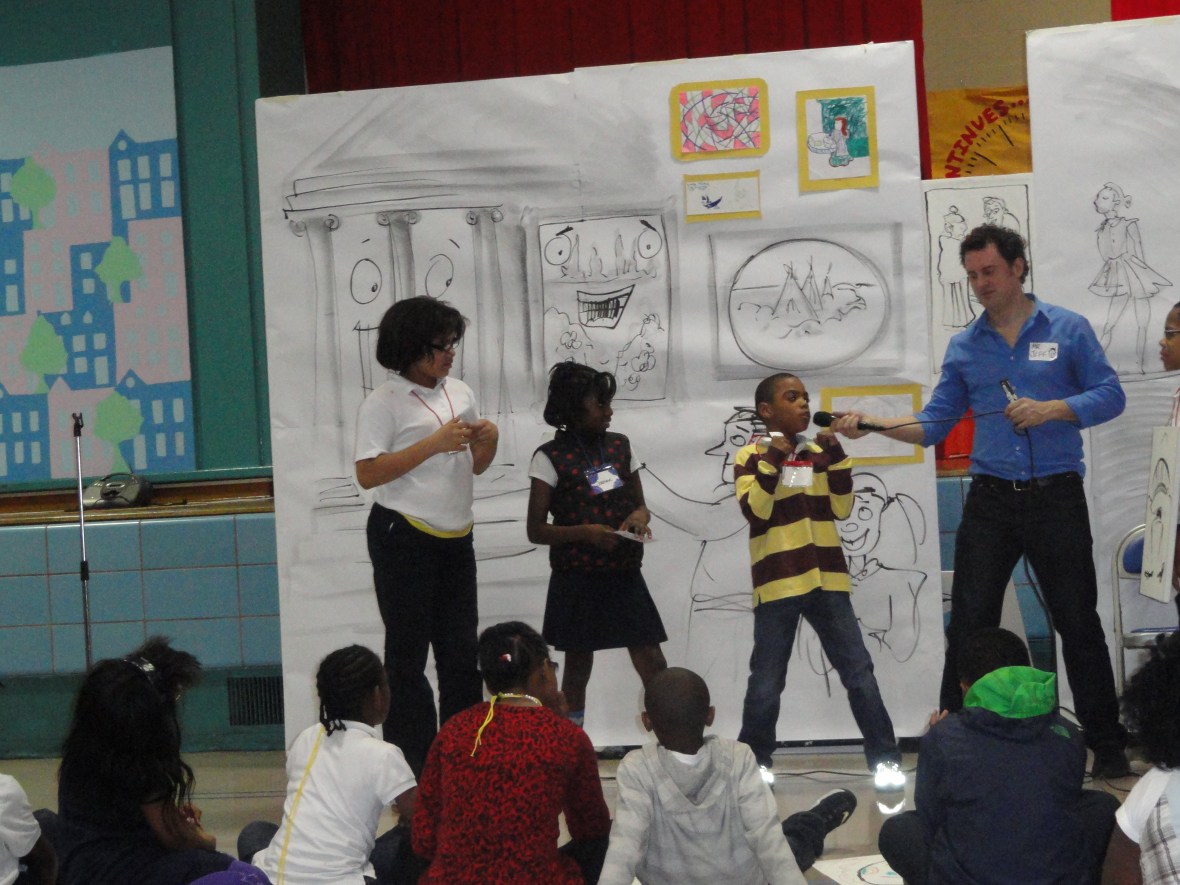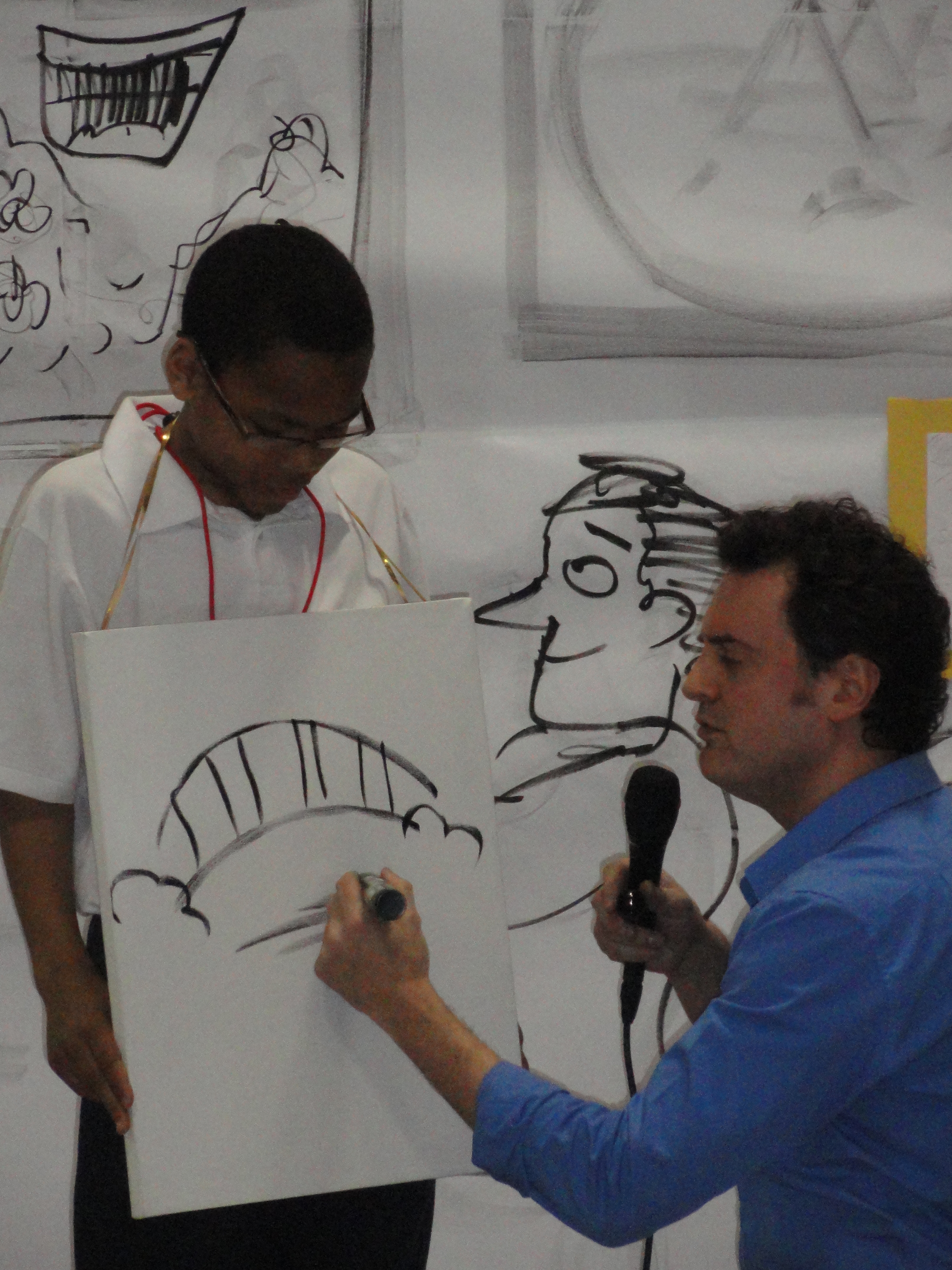 Jeff Hopkins, a visiting artist from New York, put on a wildly entertaining and interactive performance summing up our student’s knowledge of the many artists and art styles introduced throughout our tenure with the Gallery.