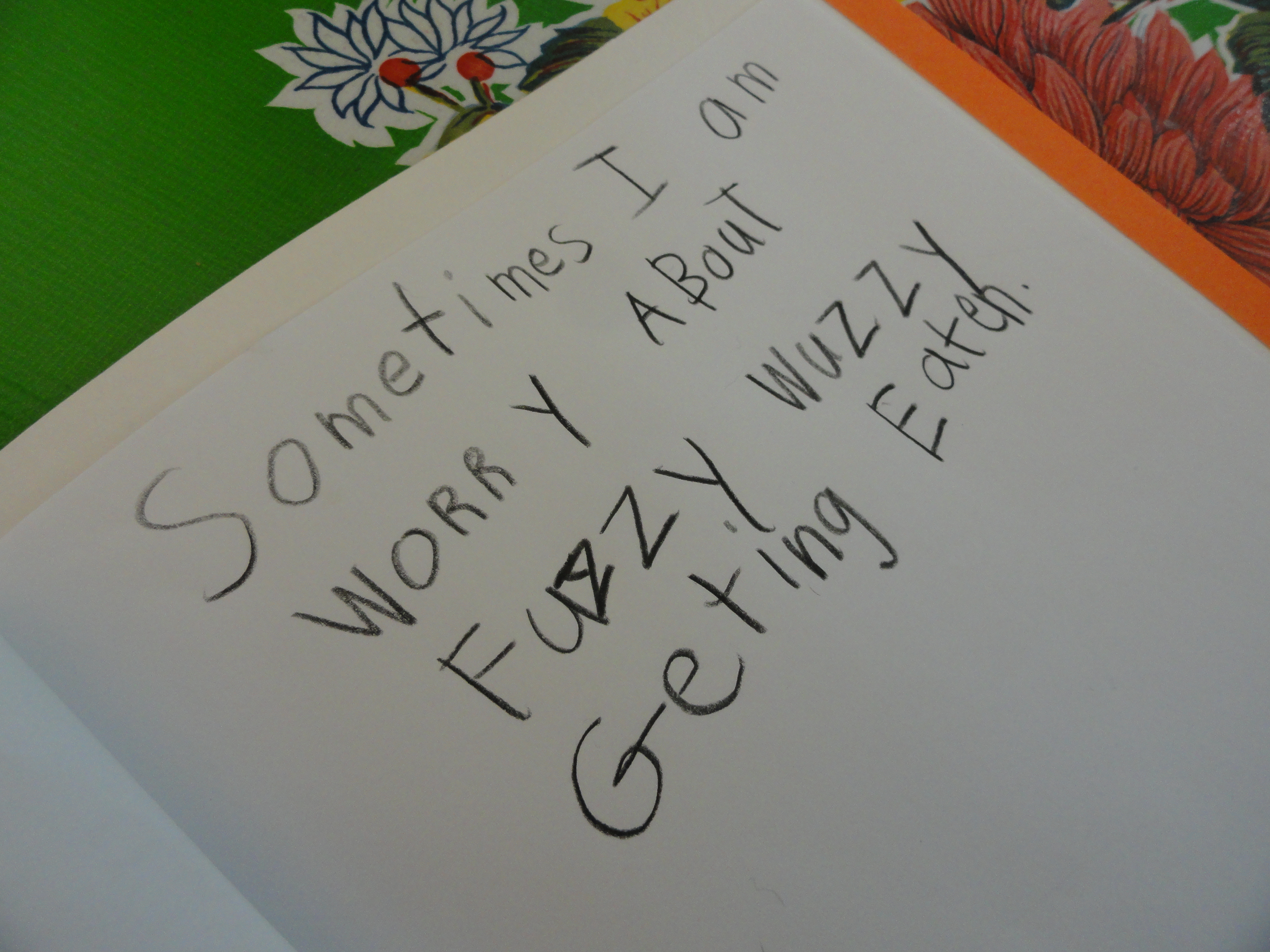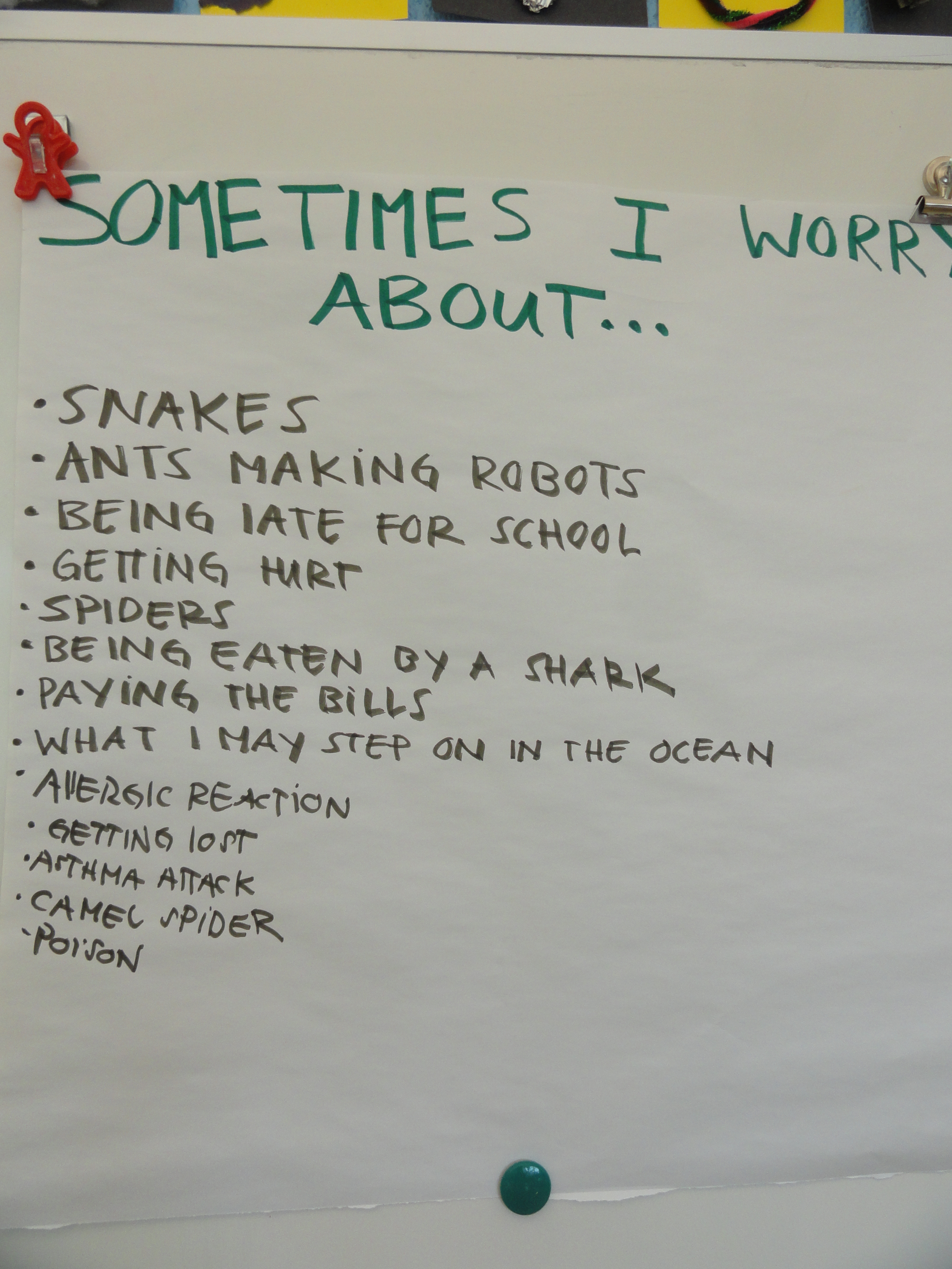 In art class, the first graders and I brainstormed a list of things we worry about. I was so pleased to see the students exhibiting their creativity and risk taking during the brainstorming stage. I also love how open we were with one another and how respectful we were of each other’s worries.