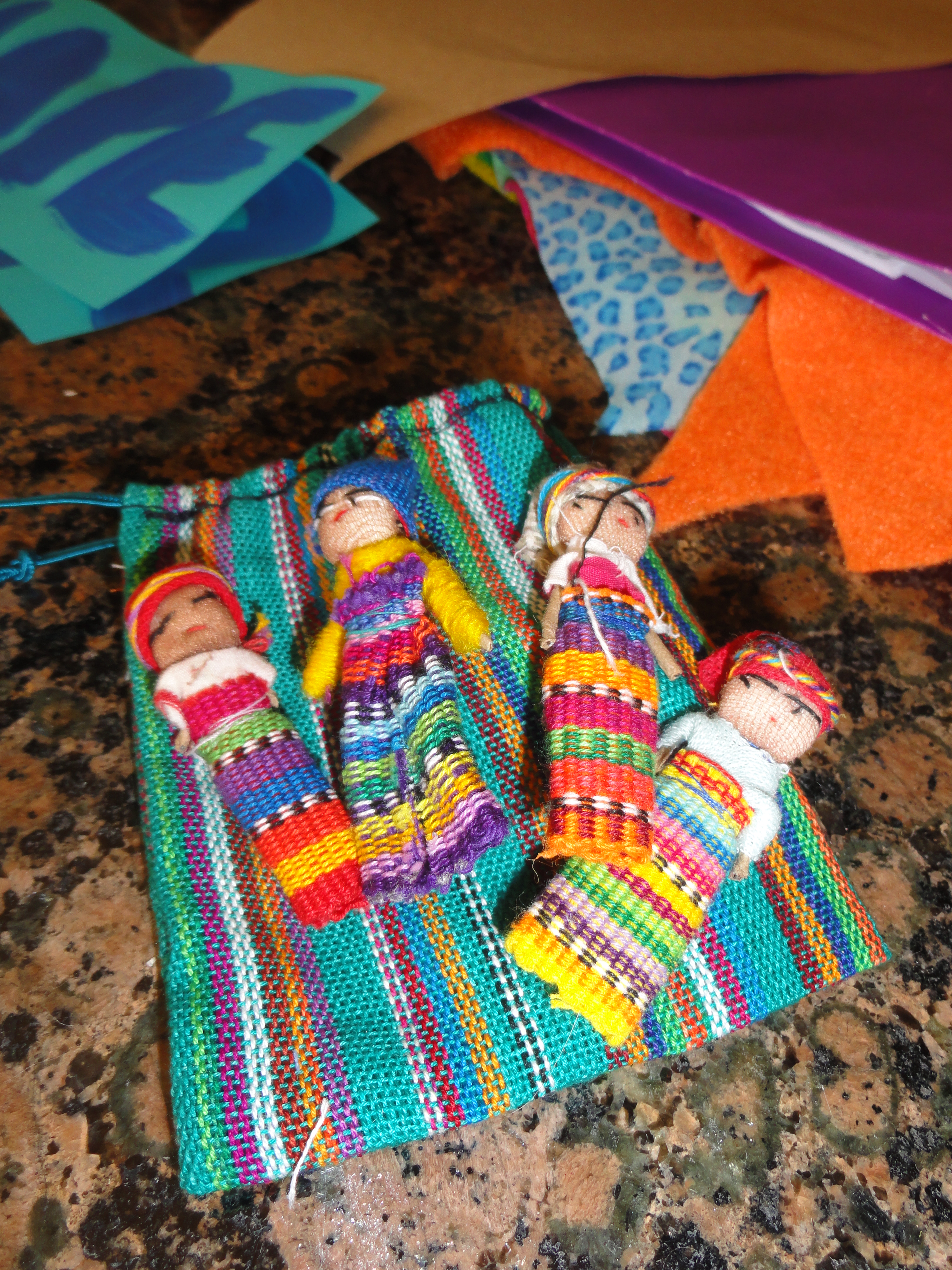 In Guatemala, there is a folk tradition of creating small dolls called Worry Dolls or Trouble Dolls to ease the fears and worries of daily life. The folk tradition states that if you whisper your worries to your small, handmade dolls and stick them under your pillow at night (ala the tooth fairy), the dolls will happily take on your worries for you so that you can go about the following day worry free! These dolls in no way take the place of gods or religion, they are simply used to help ease the minds of worrisome children.