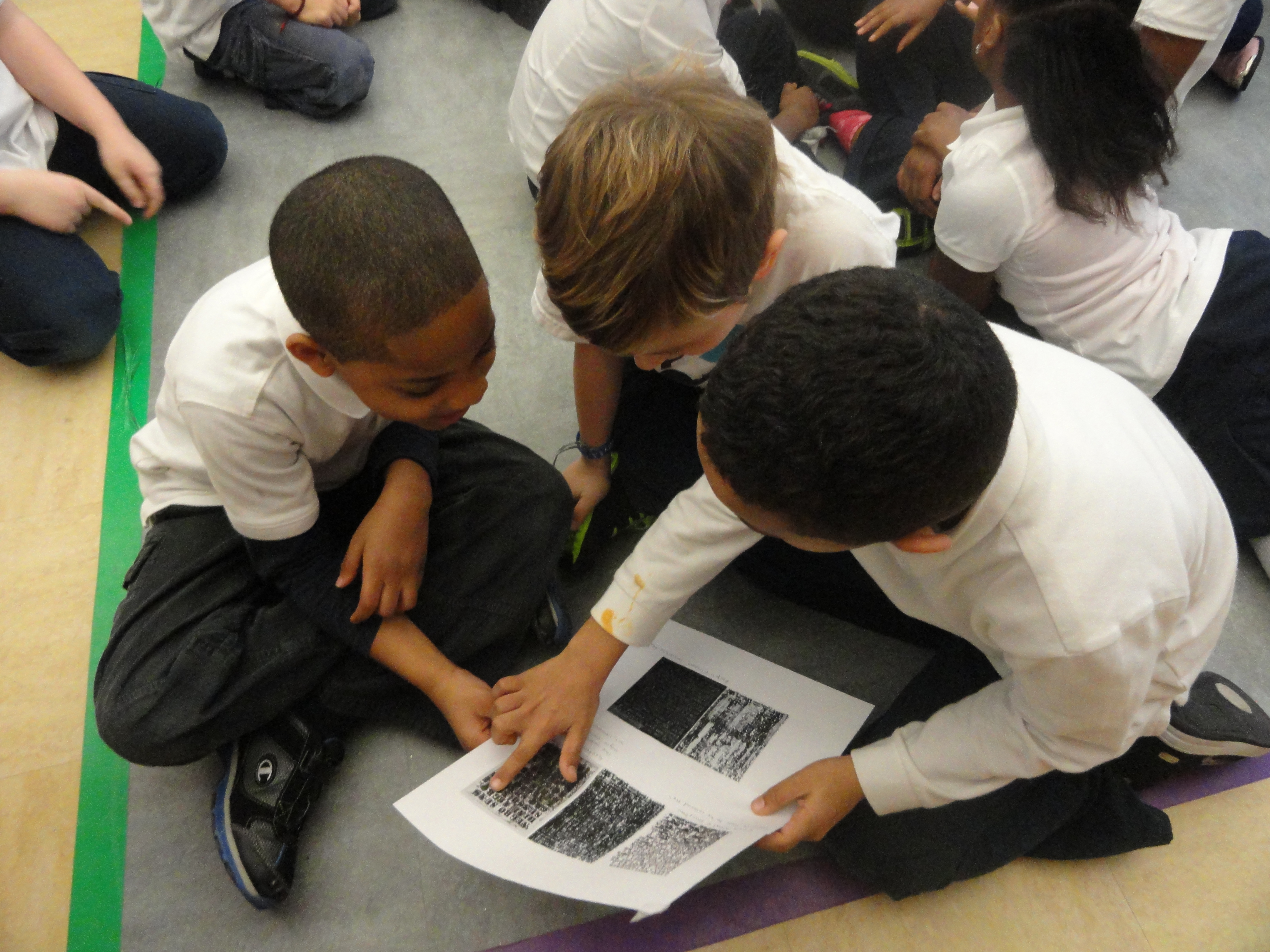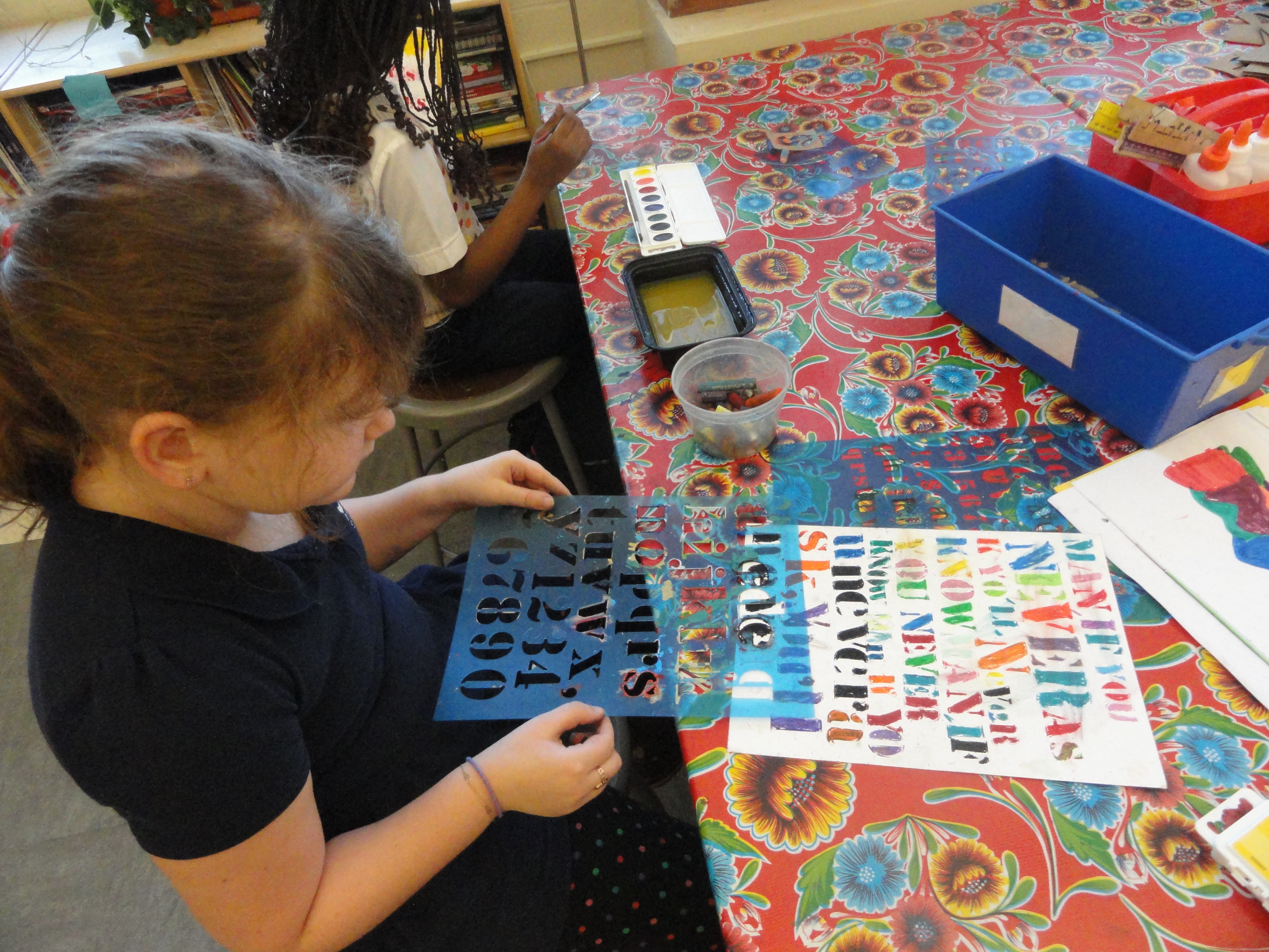 We worked in the same media used by Ligon to better understand his process–oil pastels and stenciled text. The way the pastels smear across the paper when you lift the stencil help to create the illegible feel that is a signature of Ligon’s work.