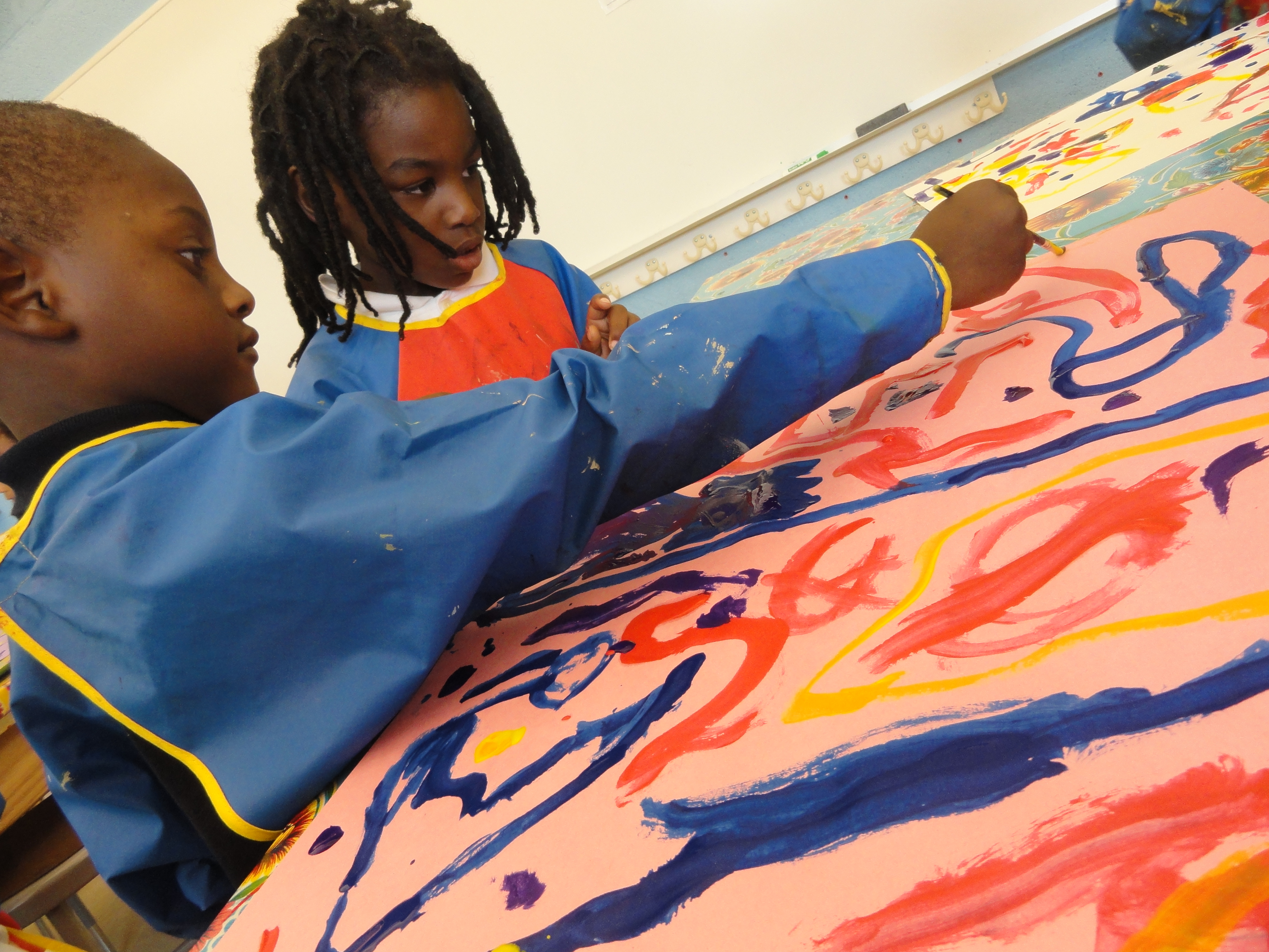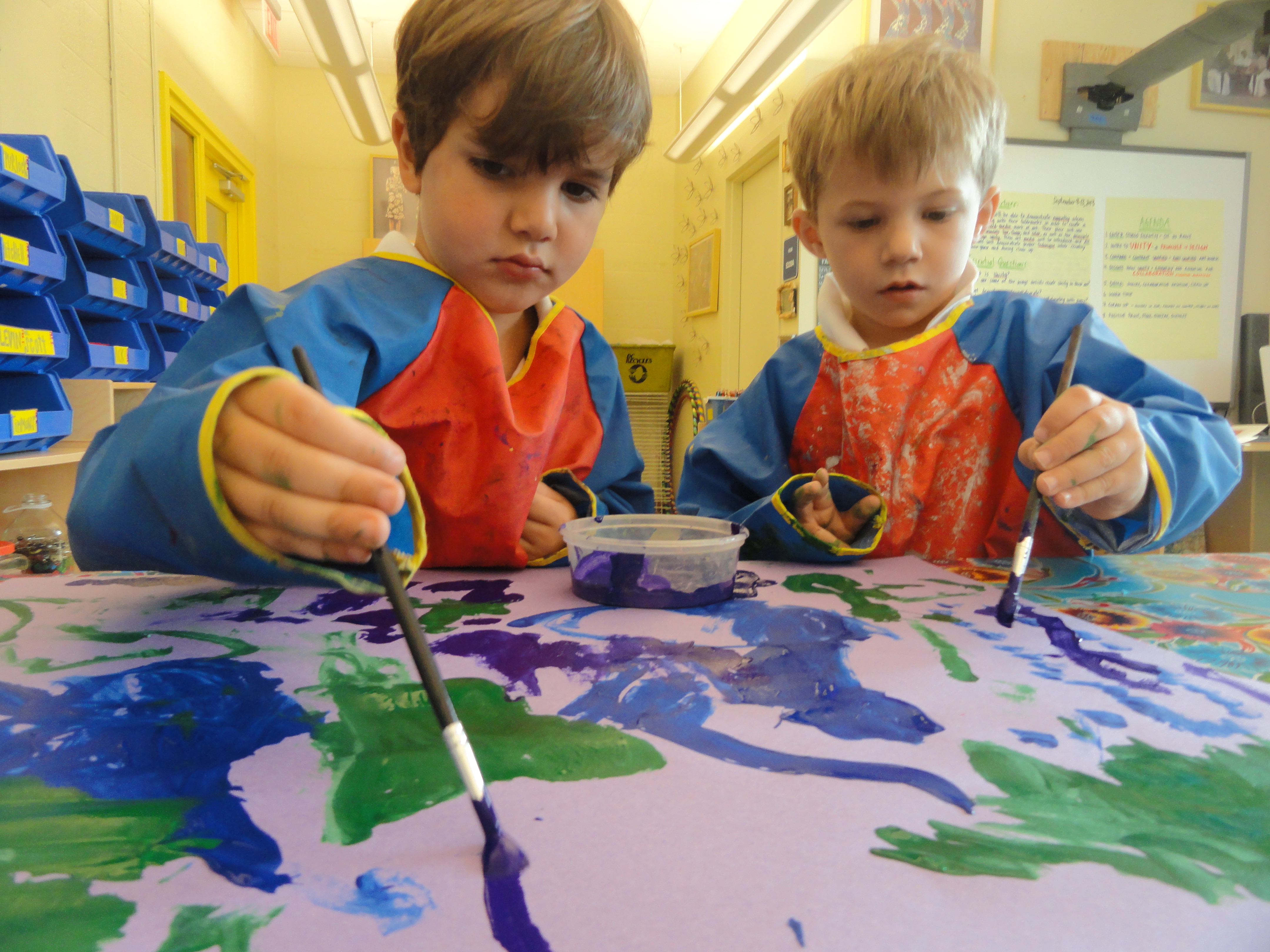 First days of school 081Two preK students demonstrate how to successfully share a canvas in the creation of our school Ashoka Empathy Tree