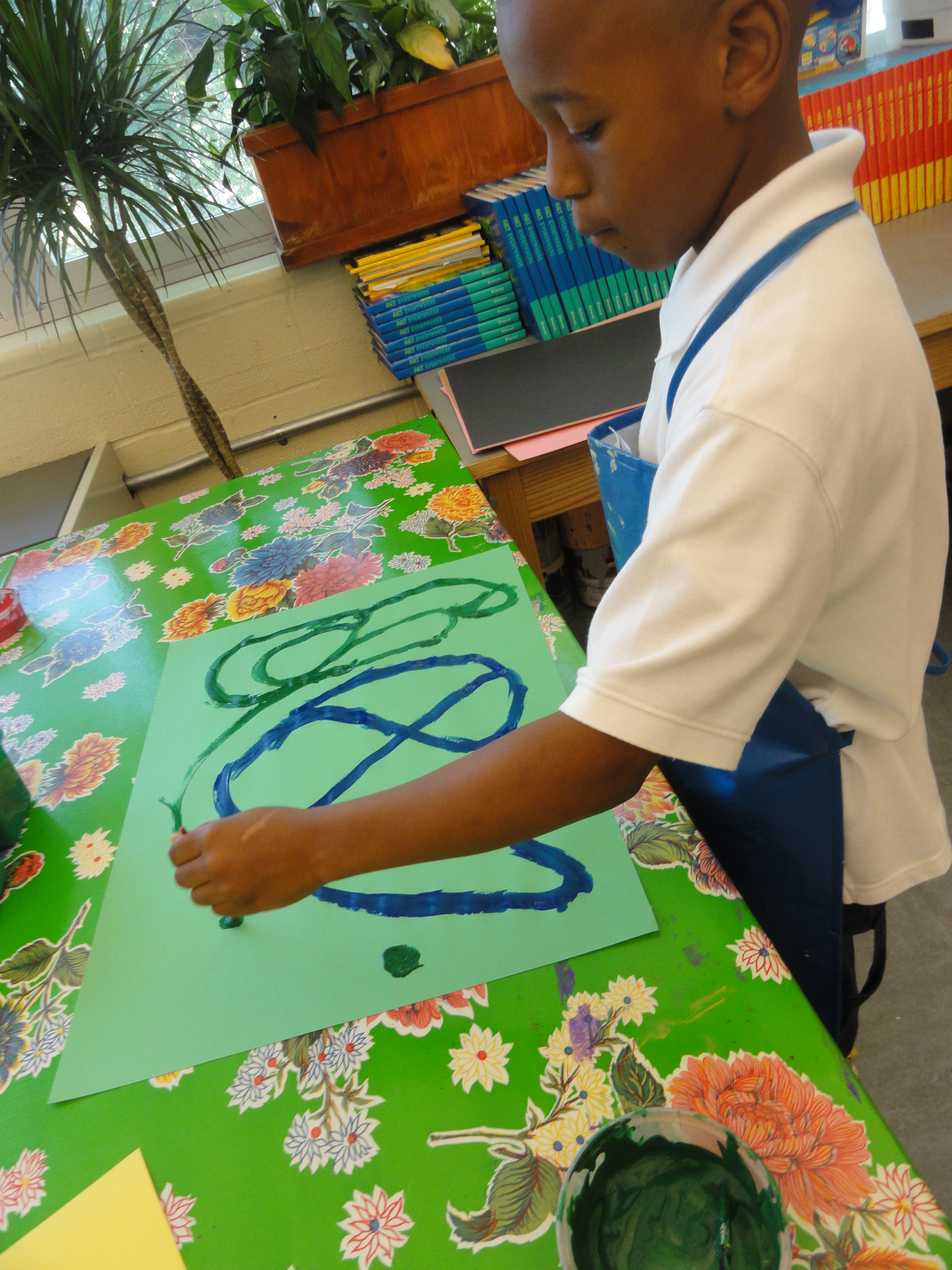 First days of school 092This artist is the second person to collaborate on this canvas. His green paint serves as a way to follow his mark throughout the studio. He is doing a nice job of unifying the work.