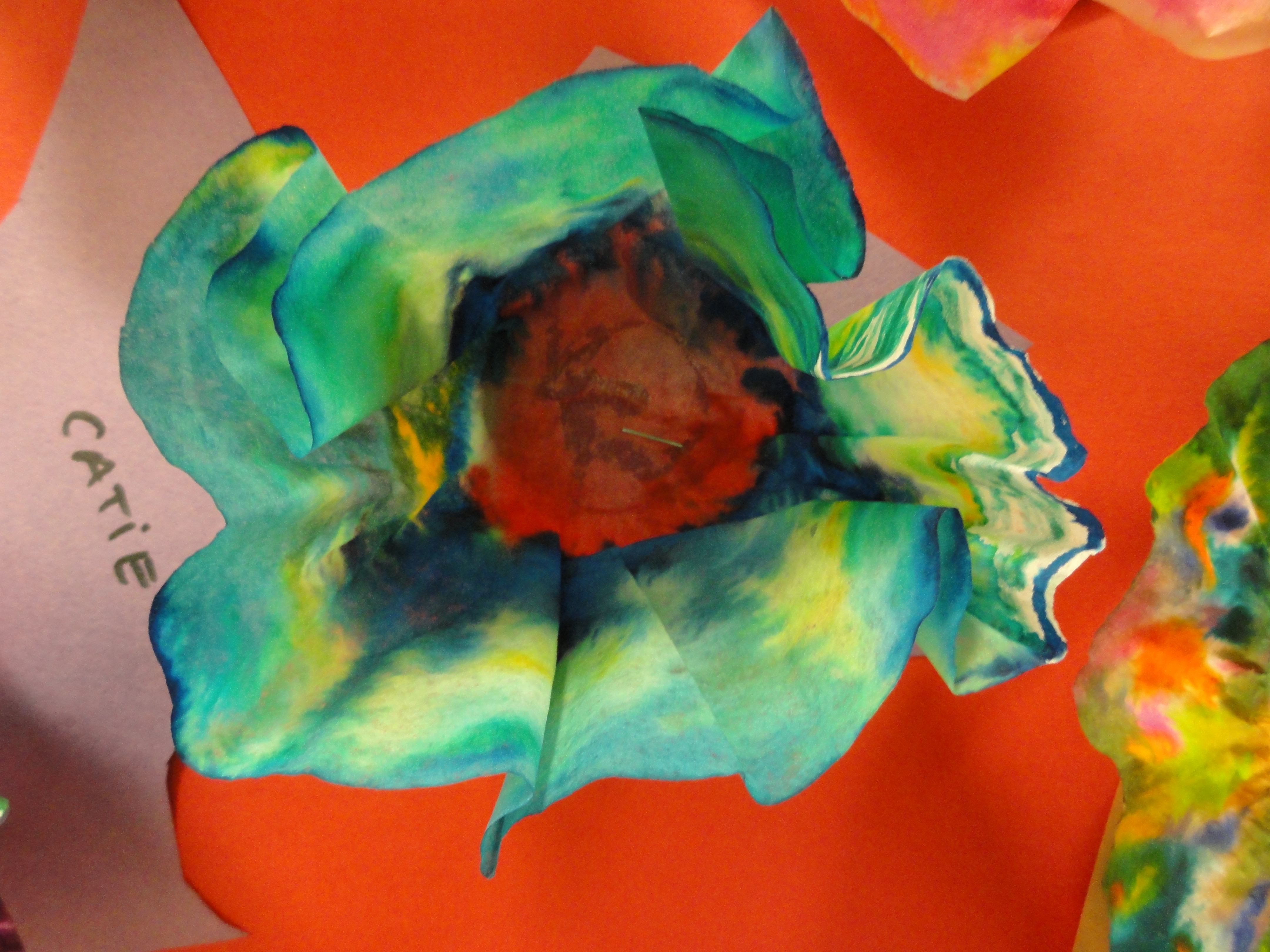 Our macchias, made from coffee filters, introduced us to color blending and manipulating forms. We created “spotted” designs with washable markers on coffee filters then sprayed the filters with liquid starch and sculpted the wet, liquid forms as if we were bending molten glass. When the starch dried, our macchias froze in the positions we sculpted them in. The process mimicked the time sensitive nature of glass. Artists must work quickly to form their pieces before the 2000 degree glass cools. Each Maury macchia is unique in form and color. Can you spot your favorite?