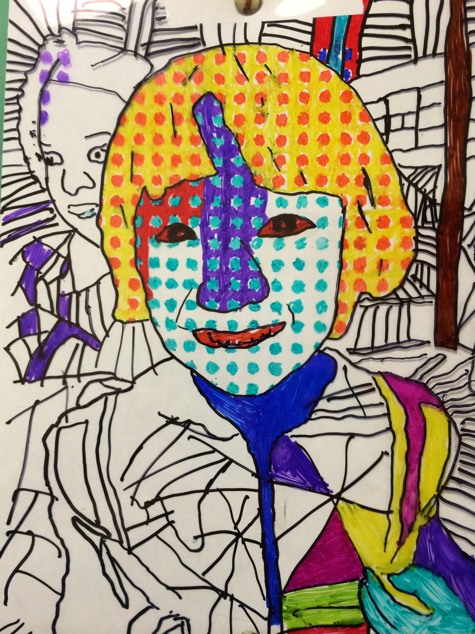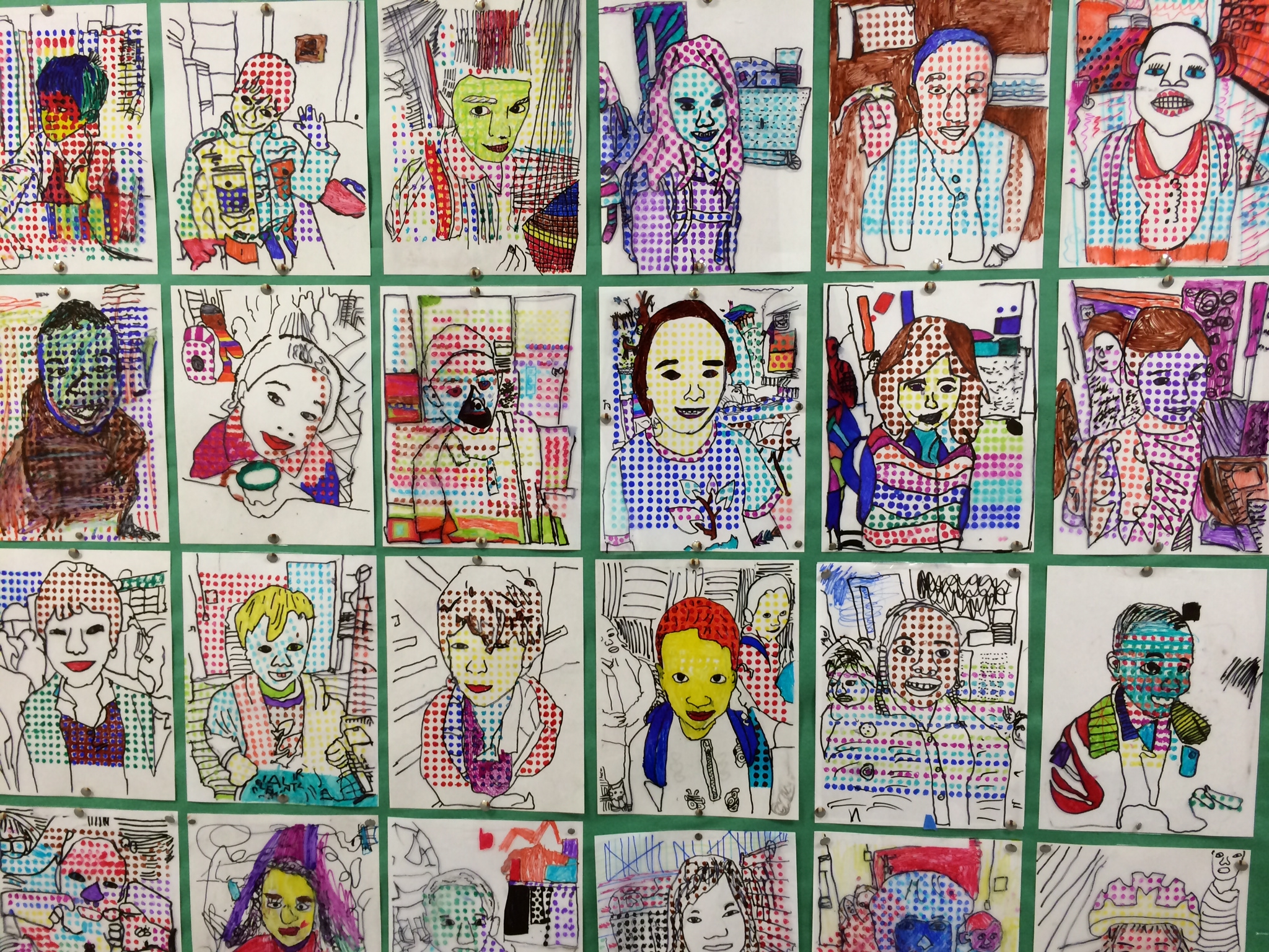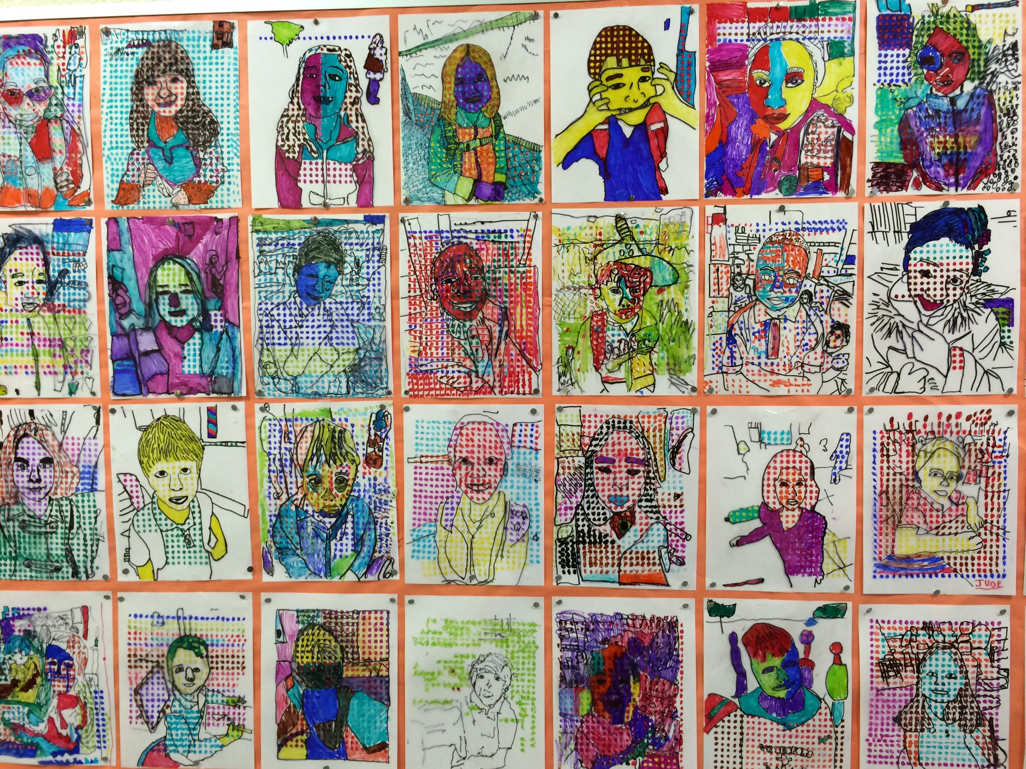 In case you haven’t been by to see the artwork on display, here is a glimpse at how our Roy Lichtenstein “BenDay Dot” portraits wrapped up. It is so surprising to me how challenging it is for fellow teachers and even parents to see through the abstraction of these portraits when trying to identify a student. Over the course of this contour line portrait project, I became so familiar with the students work and style that each individual face rings out, clear as a bell, to me. I guess that’s an added perk of being the art teacher–I feel so privileged to get to know each individual student in such a personal and unique way. I feel pretty confident that I could identify almost any of my 340 students by simply looking at any piece of their work and deciphering the personal style before me. See if you can point out some of your child’s friends in the gallery below.