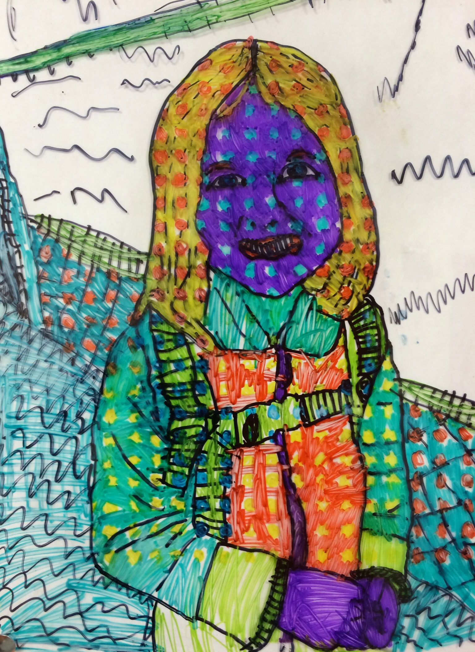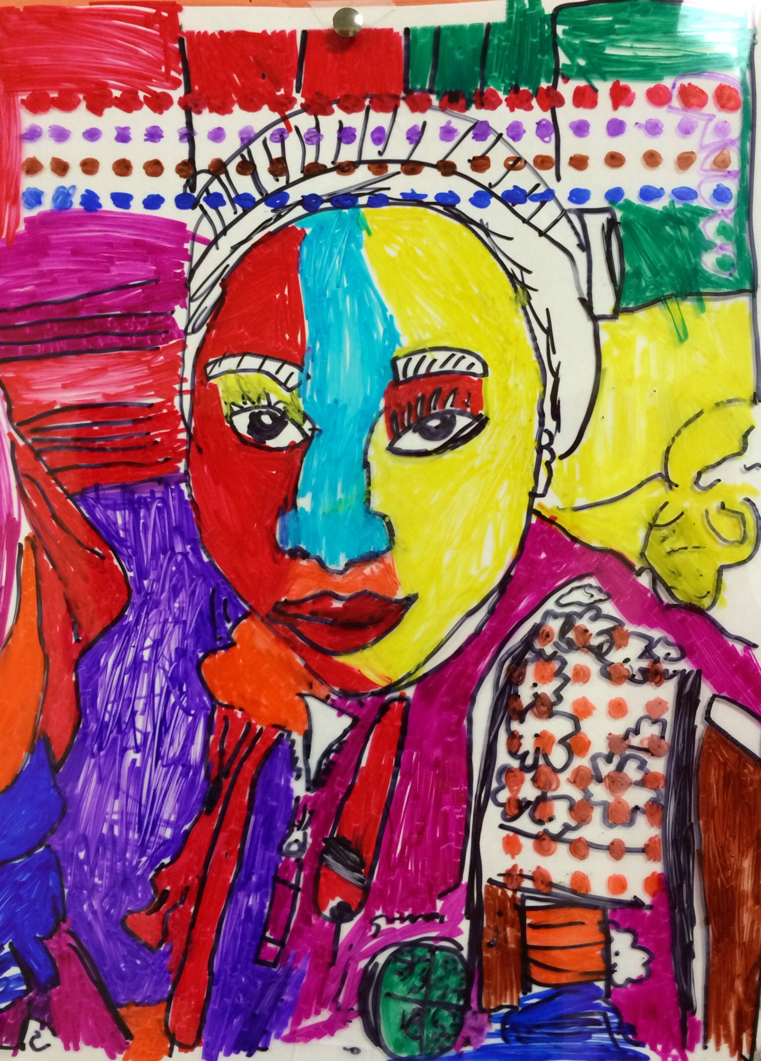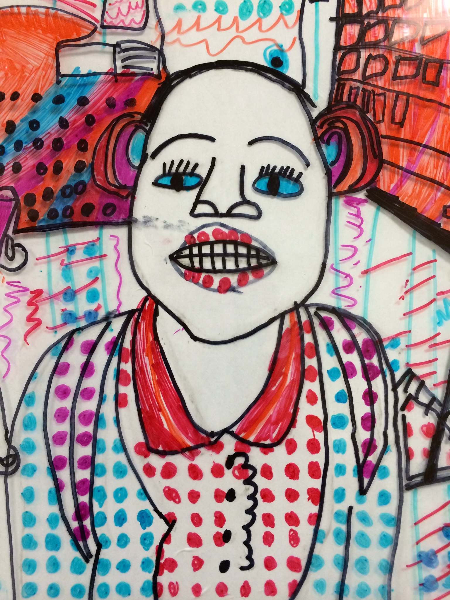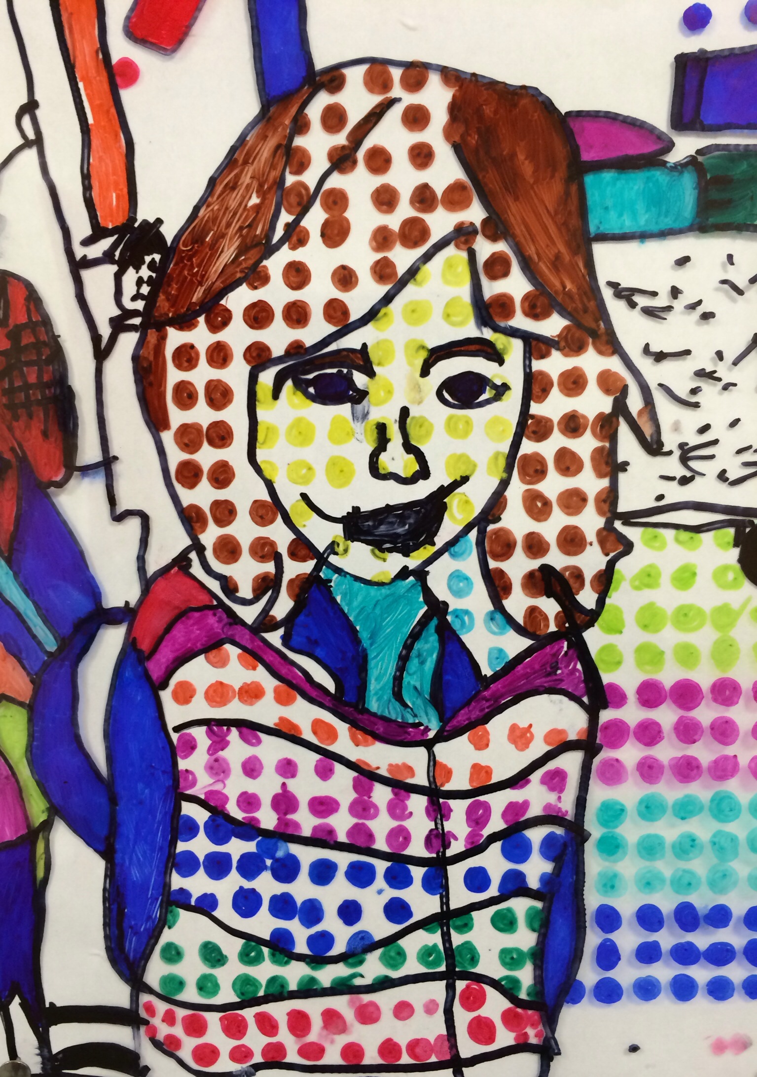 In case you haven’t been by to see the artwork on display, here is a glimpse at how our Roy Lichtenstein “BenDay Dot” portraits wrapped up. It is so surprising to me how challenging it is for fellow teachers and even parents to see through the abstraction of these portraits when trying to identify a student. Over the course of this contour line portrait project, I became so familiar with the students work and style that each individual face rings out, clear as a bell, to me. I guess that’s an added perk of being the art teacher–I feel so privileged to get to know each individual student in such a personal and unique way. I feel pretty confident that I could identify almost any of my 340 students by simply looking at any piece of their work and deciphering the personal style before me. See if you can point out some of your child’s friends in the gallery below.
