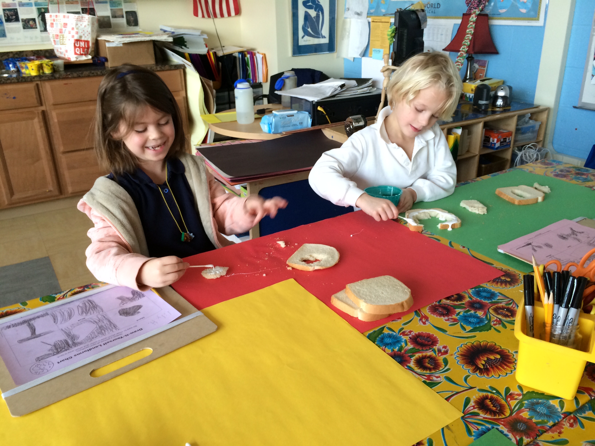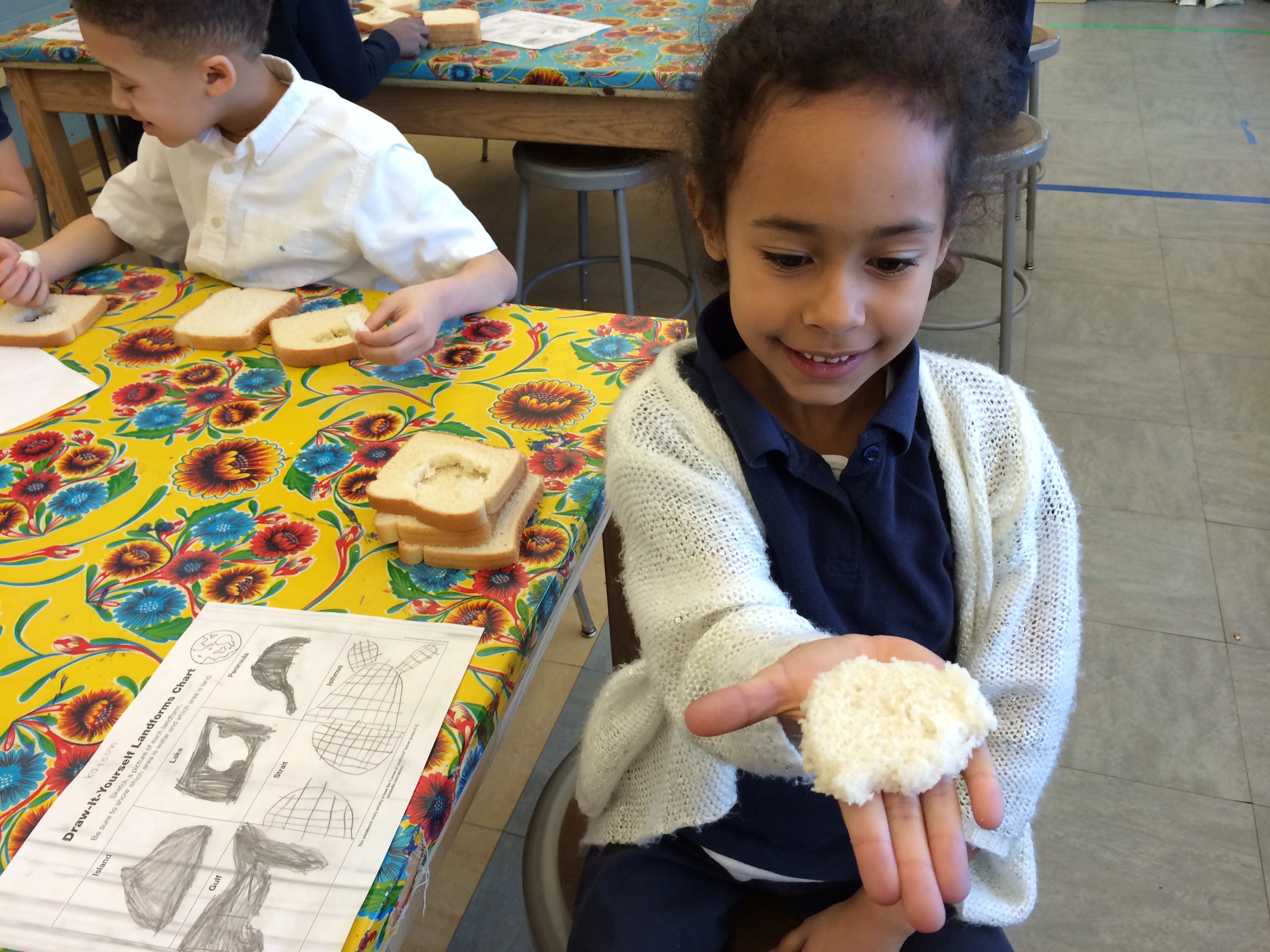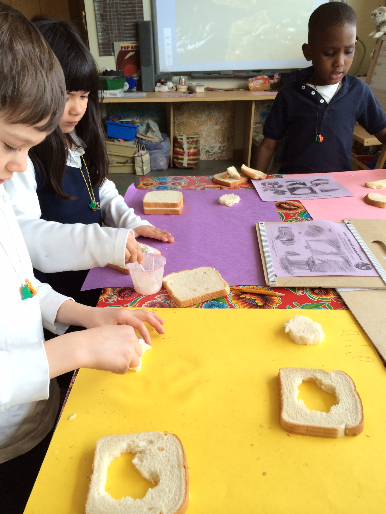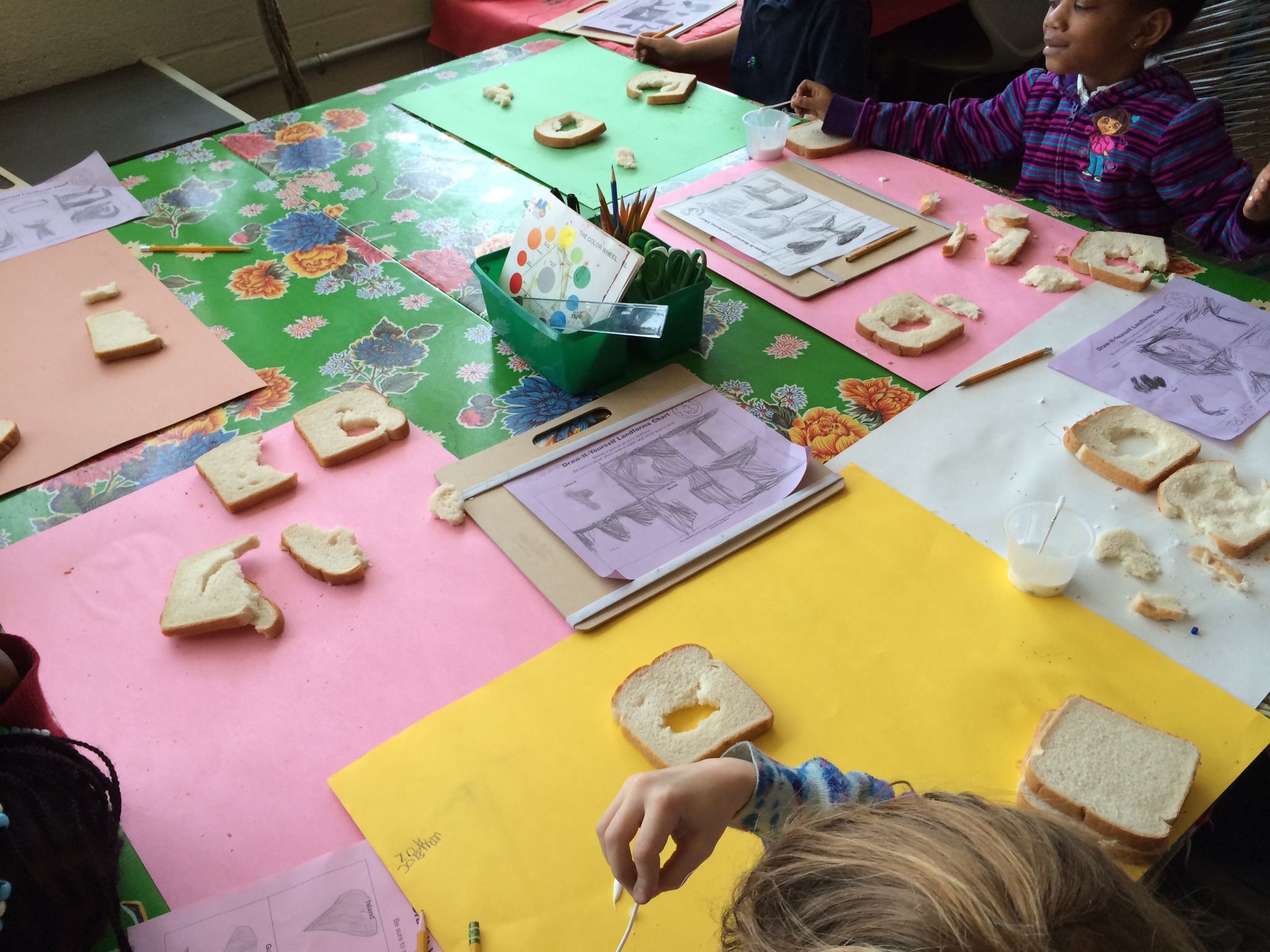 These kids are pros and have spent time charting, sketching, and carving positive and negative space land forms from sandwich bread (30 loaves, y’all)! The next phase of their geographic study is to create abstract oil pastel and water color resist paintings of all 6 land forms highlighting their unique spacial relationship.