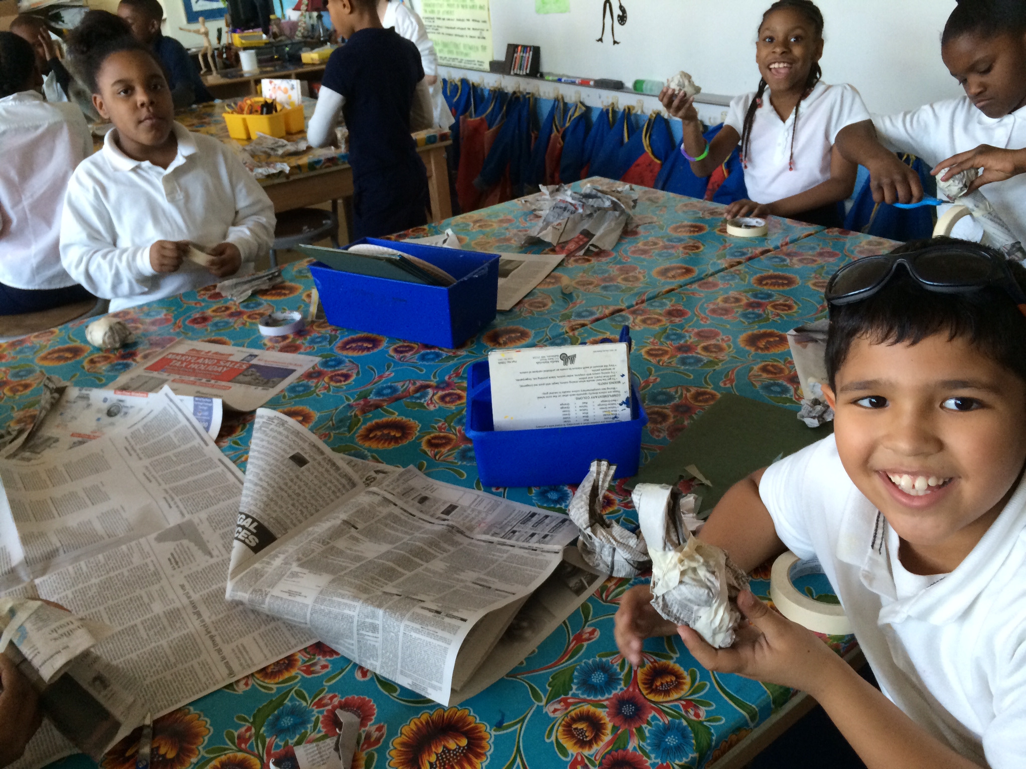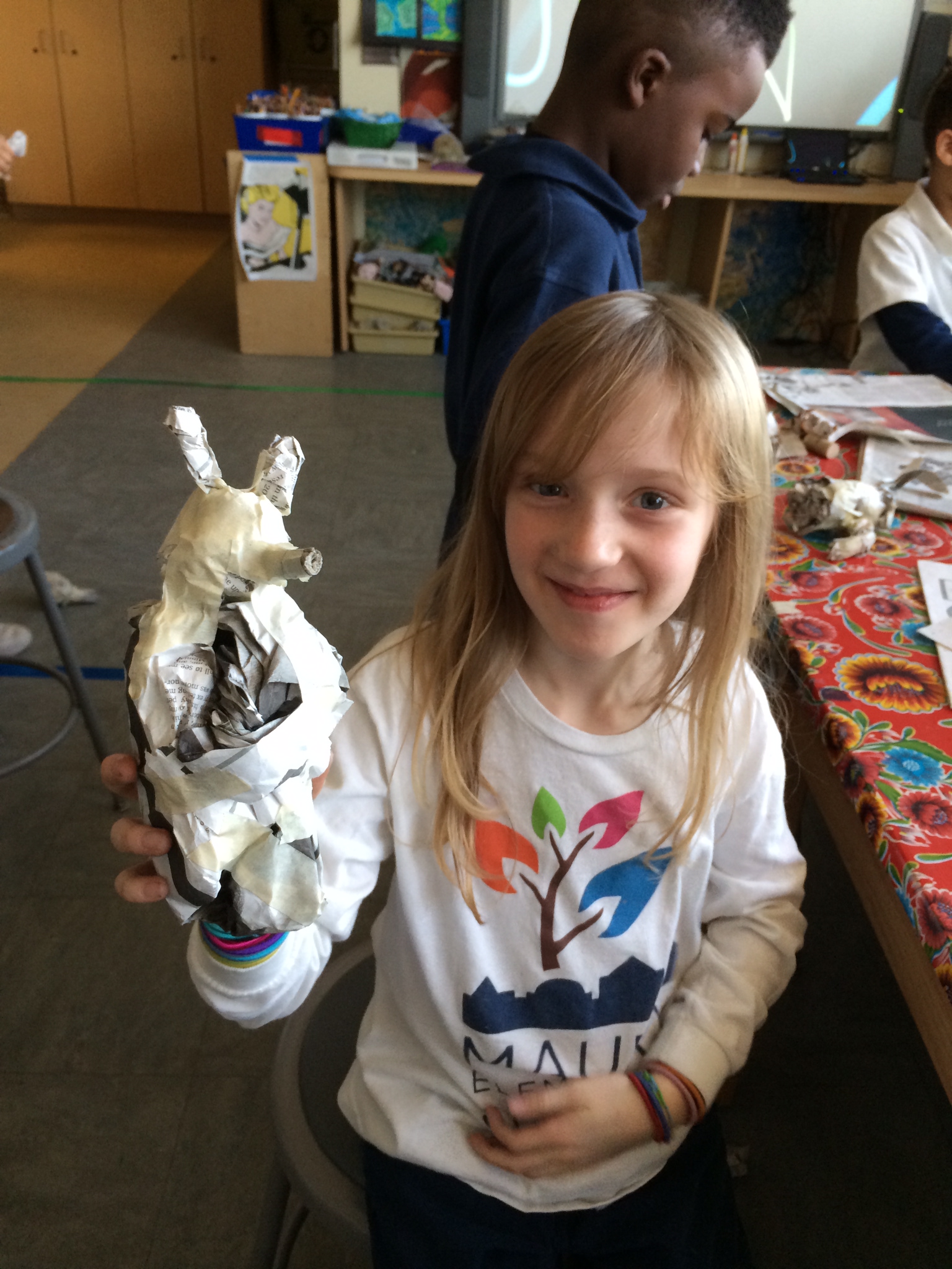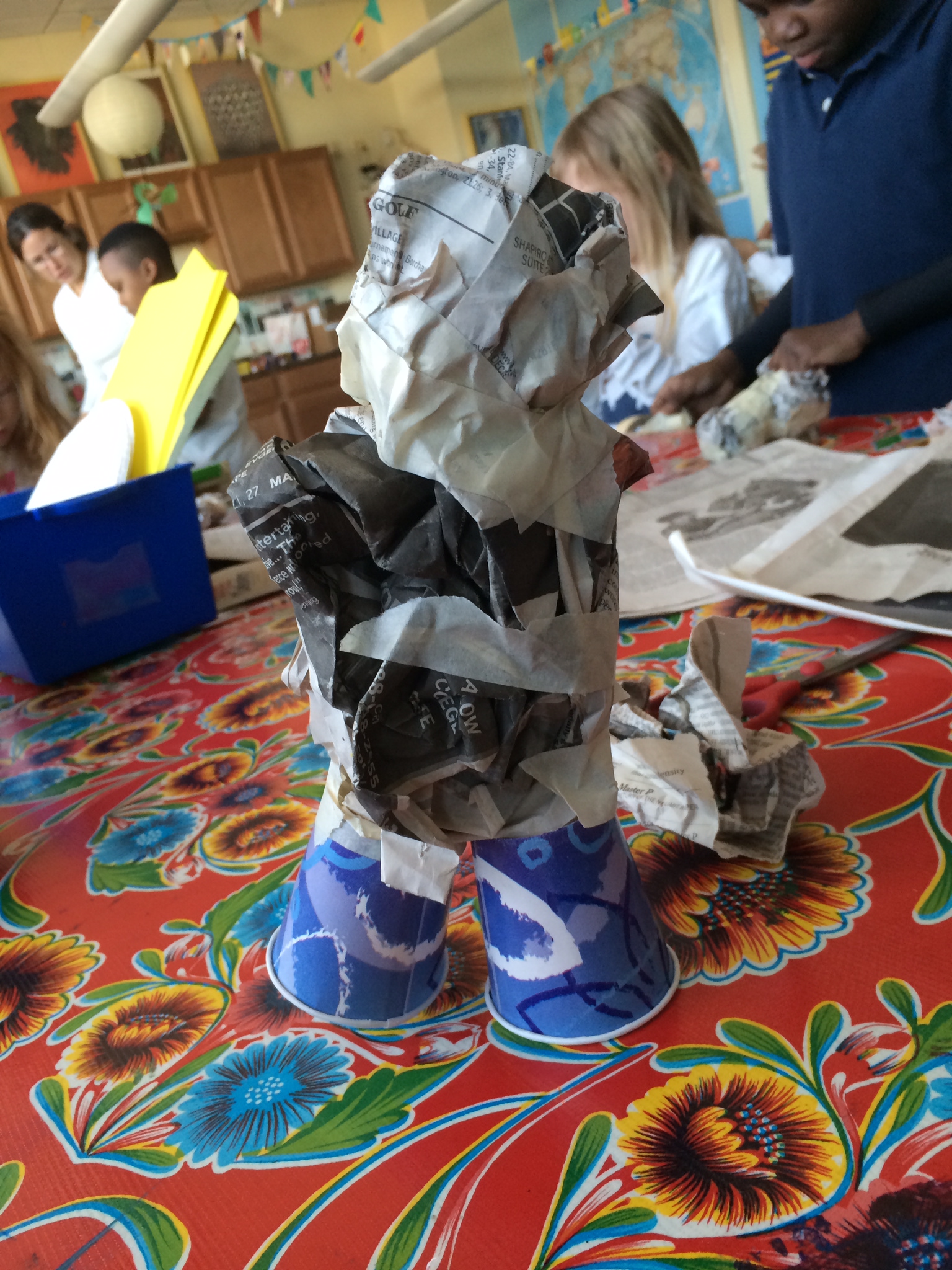 Third grade has had complete freedom in their latest project. After briefly looking at the bizarre work of William Wegman and his weimaraners as a way of using animals to create human forms, third grade has latched on to the concept of anthropomorphism, or combining human and animal features to create a new species. Our unit began with the creation of photo-collages chalk full of intriguing crossbreeds. These collages were then turned into comics with hilarious dialogue bubbles giving voice to some strange species. I am bummed that I don’t currently have any photographs of the comics because they are truly weird and amazing but I’ll be sure to get some up next time. The most exciting part of this multi-step project is that students were then asked to choose one of their anthropomorphic creatures and bring them to life in 3d. We have begun building the bones of our creatures from newspaper, masking tape, corks, paper cups, Q-tips, and cardboard. We will later cover them in plaster gauze, paint, and accessorize accordingly. Sculpture is the medium that speaks most to me as an artist so I am always amused to assist students in bringing flat images to the round. Kids are born to build, design and problem solve and I am always so impressed with the level of engineering and construction they are able to muster on their own. Beginning stages below!