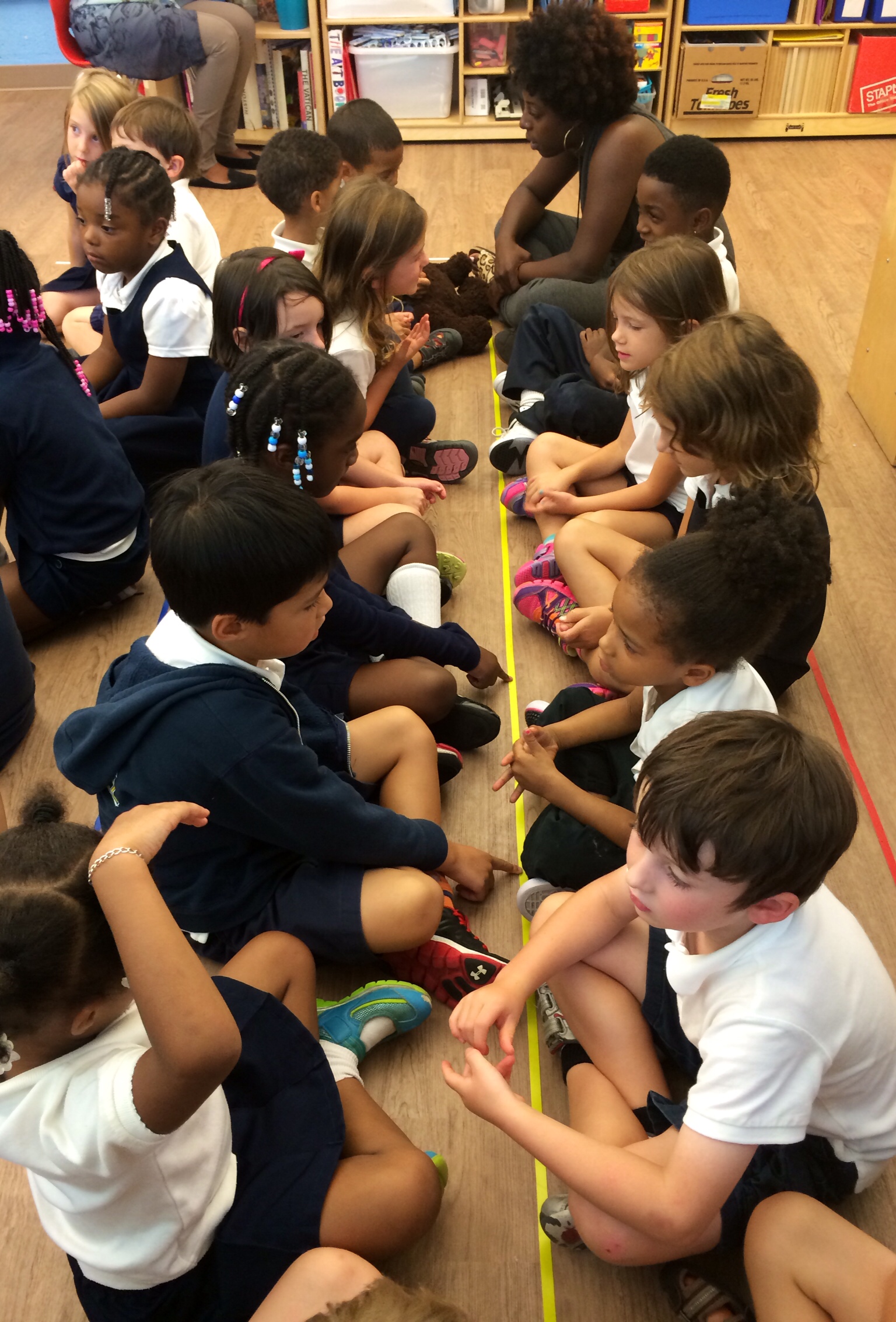 Not only were students able to begin to articulate two questions humans have been working to understand for centuries, but they have also started to take what I said about art being a communication medium seriously. During the second and third weeks of school, kindergarten-5th grade have been tasked with creating collages that successfully communicate a predetermined theme. This week, we will critique the works of art and determine which artist was able to most creatively and compellingly express meaning through visual imagery. Here are some kindergarten students demonstrating a Turn & Talk while discussing the triumphs of one of their peer’s work.