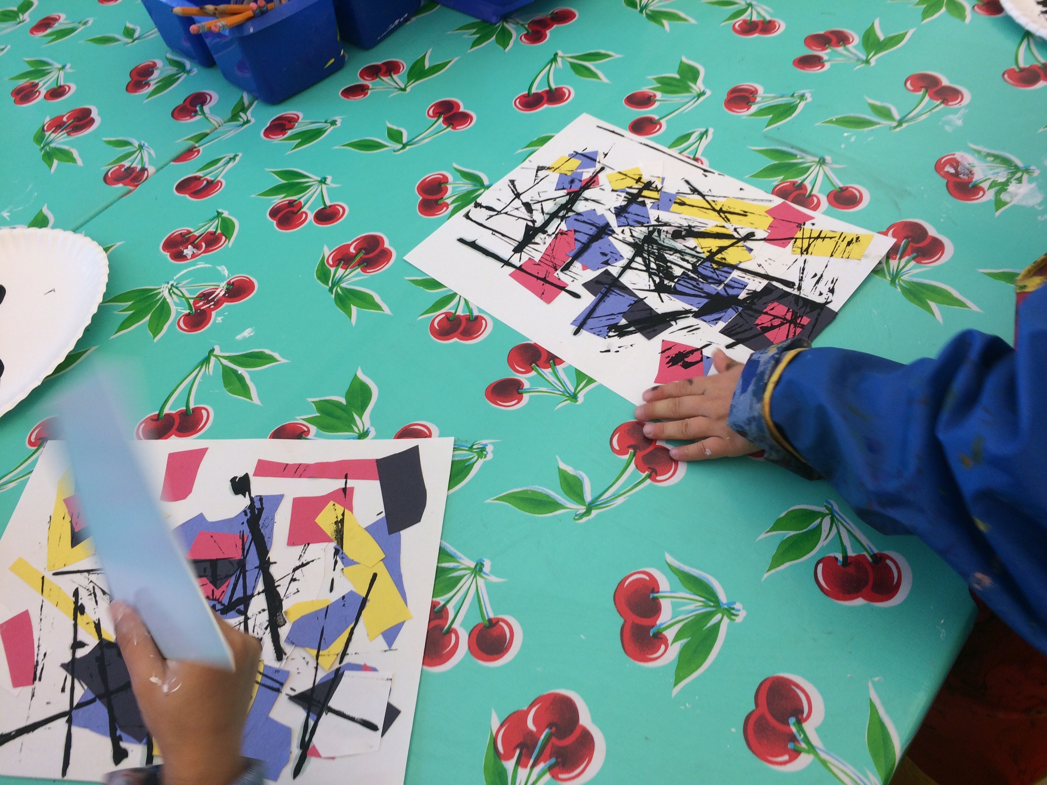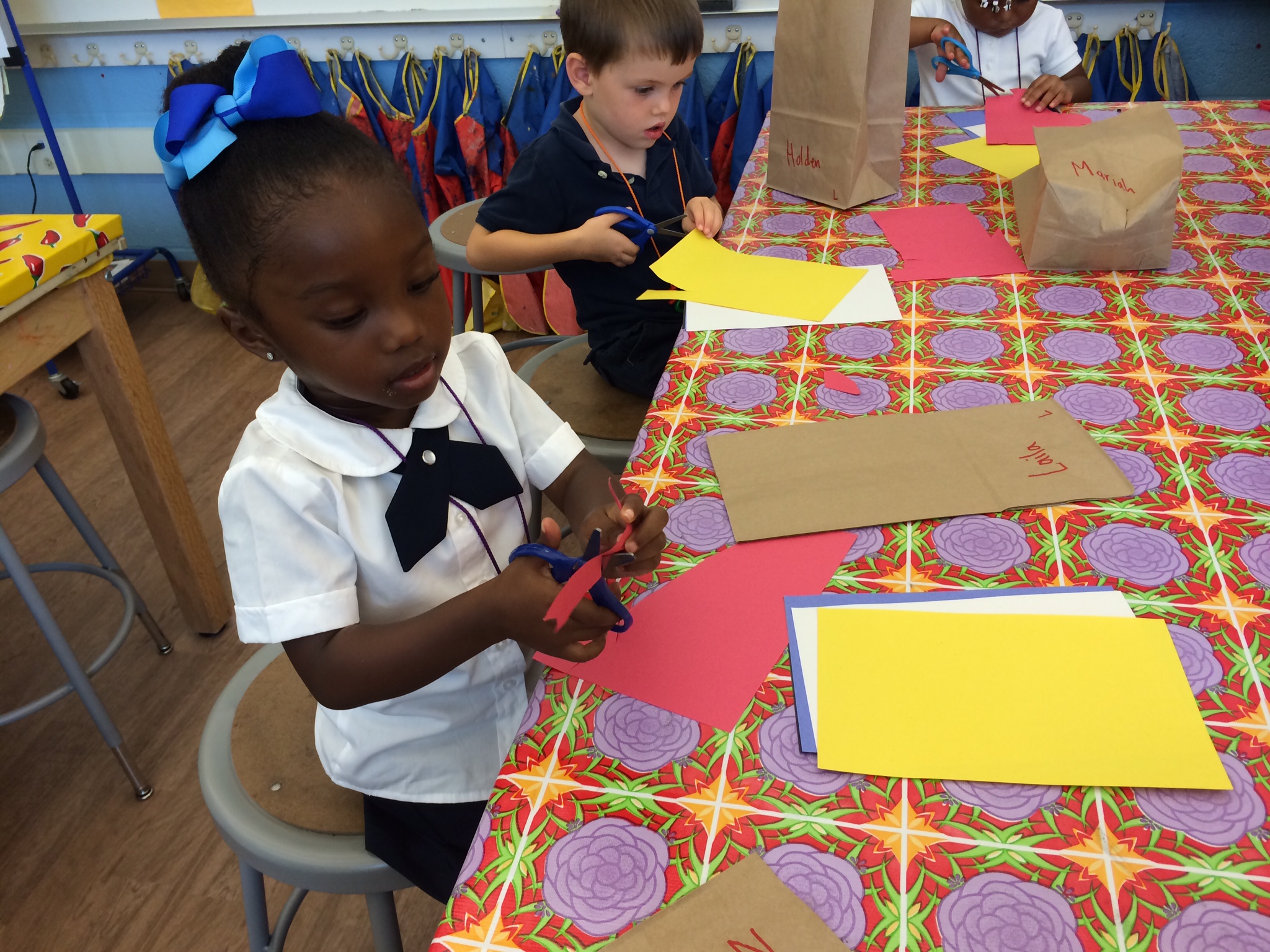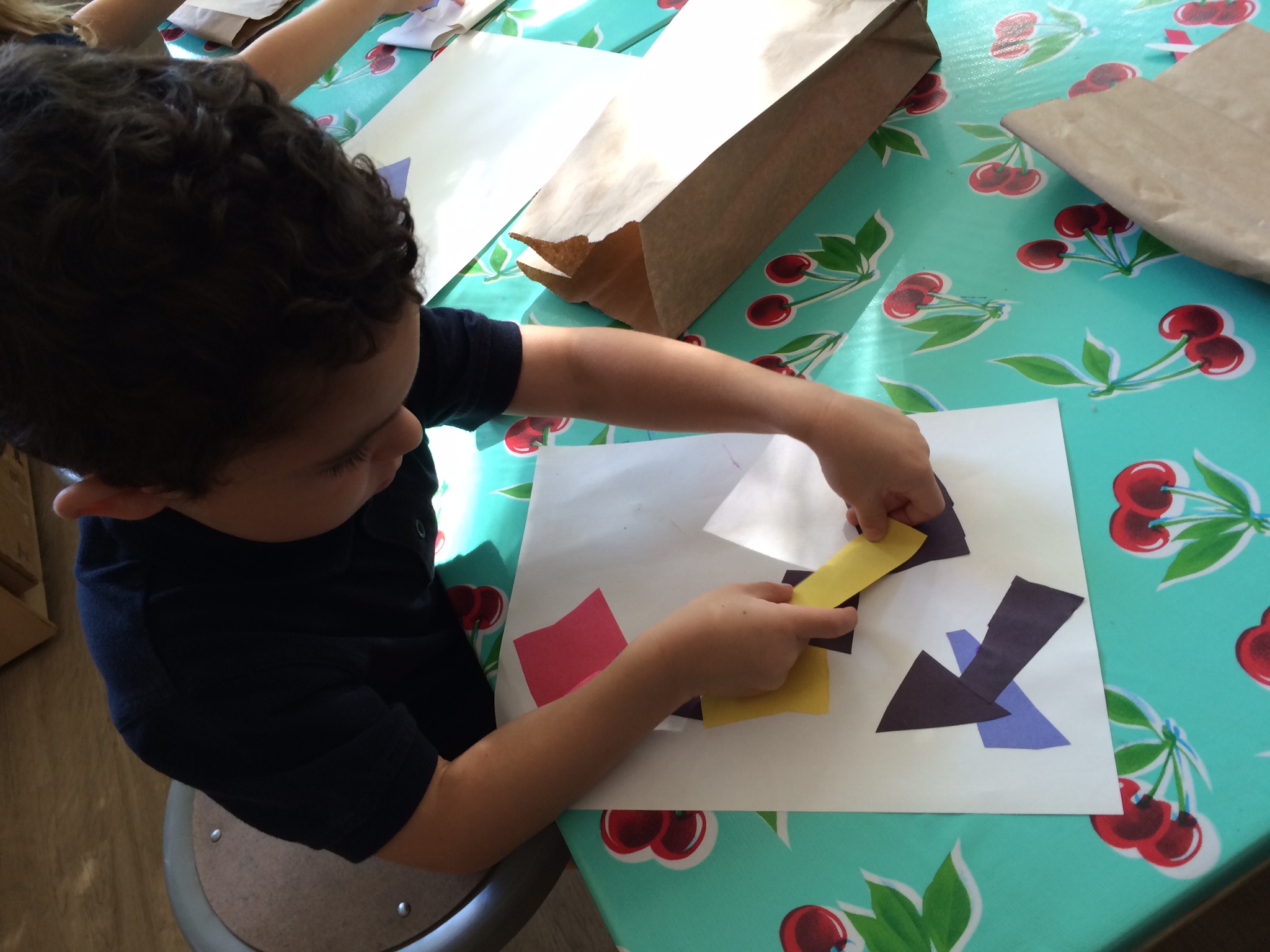 Students later combined aspects of both Mondrian and Bearden’s work to get their own primary colored, geometric shape, cut paper collages! Here are a few pictures of students practicing how to cut geometric shapes from primary colored paper and learning how to properly apply glue to their cut shapes.