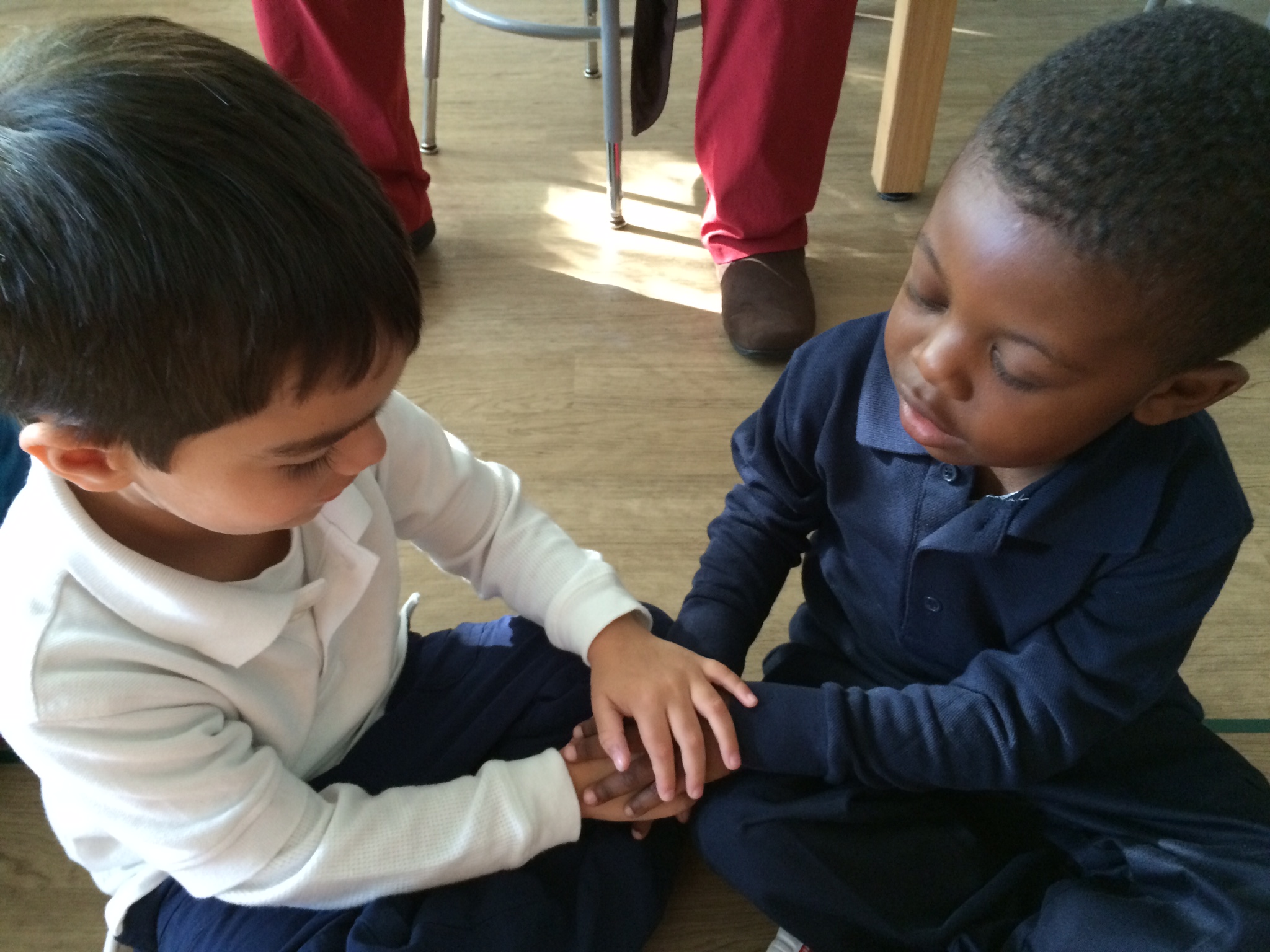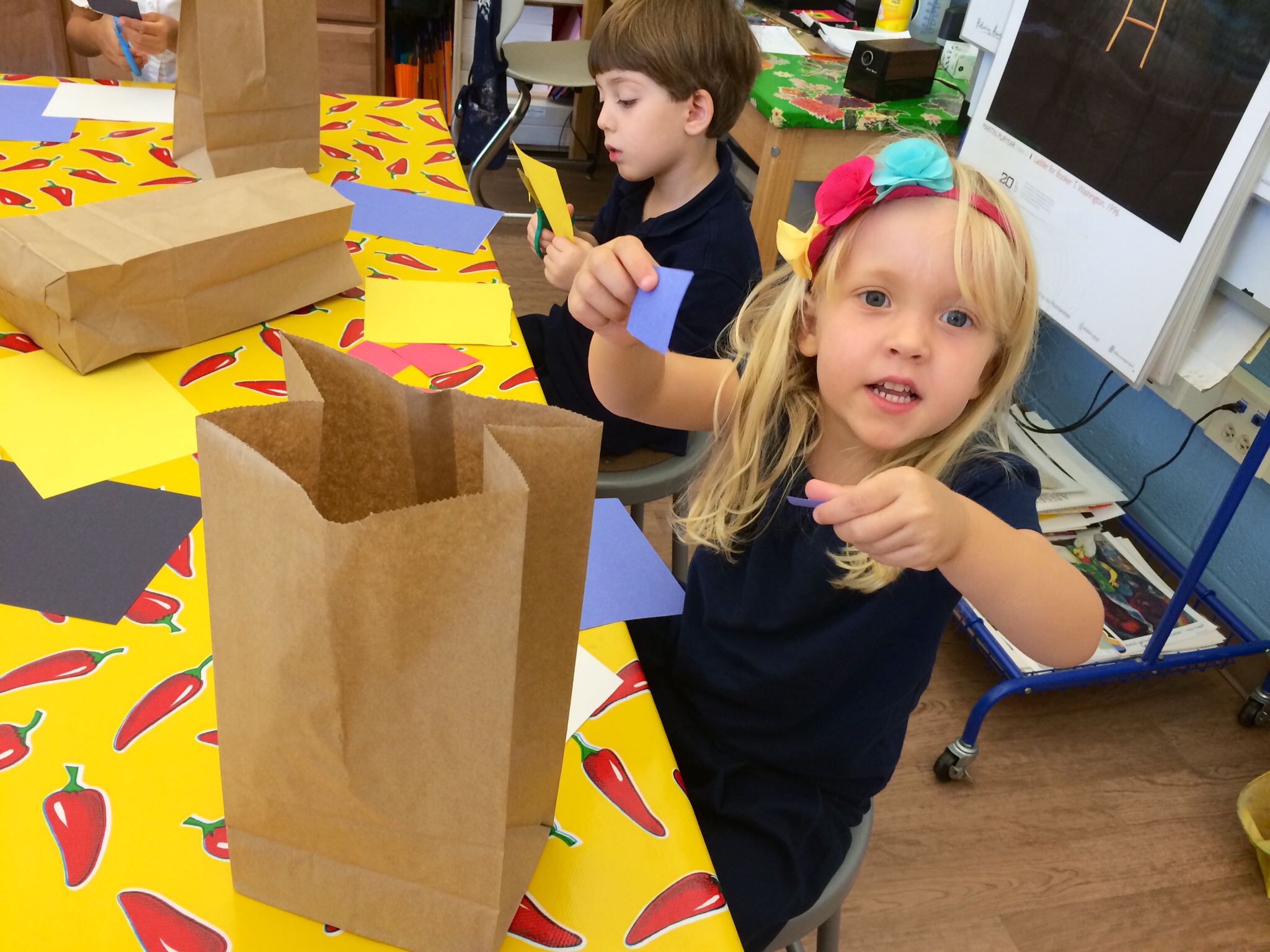 Beginning with the art of scissor-holding, students, paras, and Ms. Bomba were united in song as we paraded to the beat of our feet holding our scissors “ice-cream cone style,” or blade down, in order to stay safe. We used our crab claws to “pinch,” or open and close the scissor blades making it easier to cut geometric shapes, like the ones seen in many of Mondrian’s paintings.