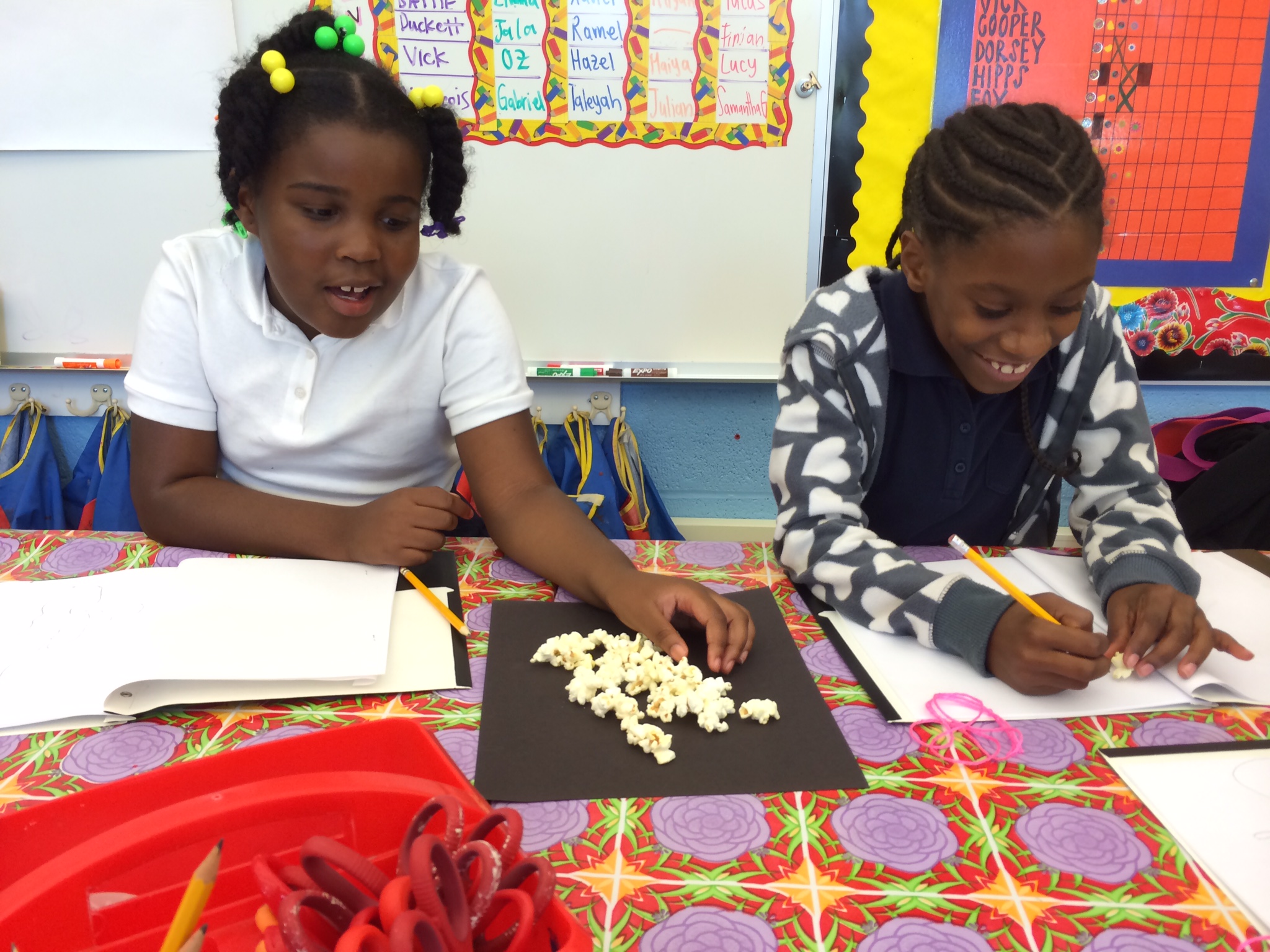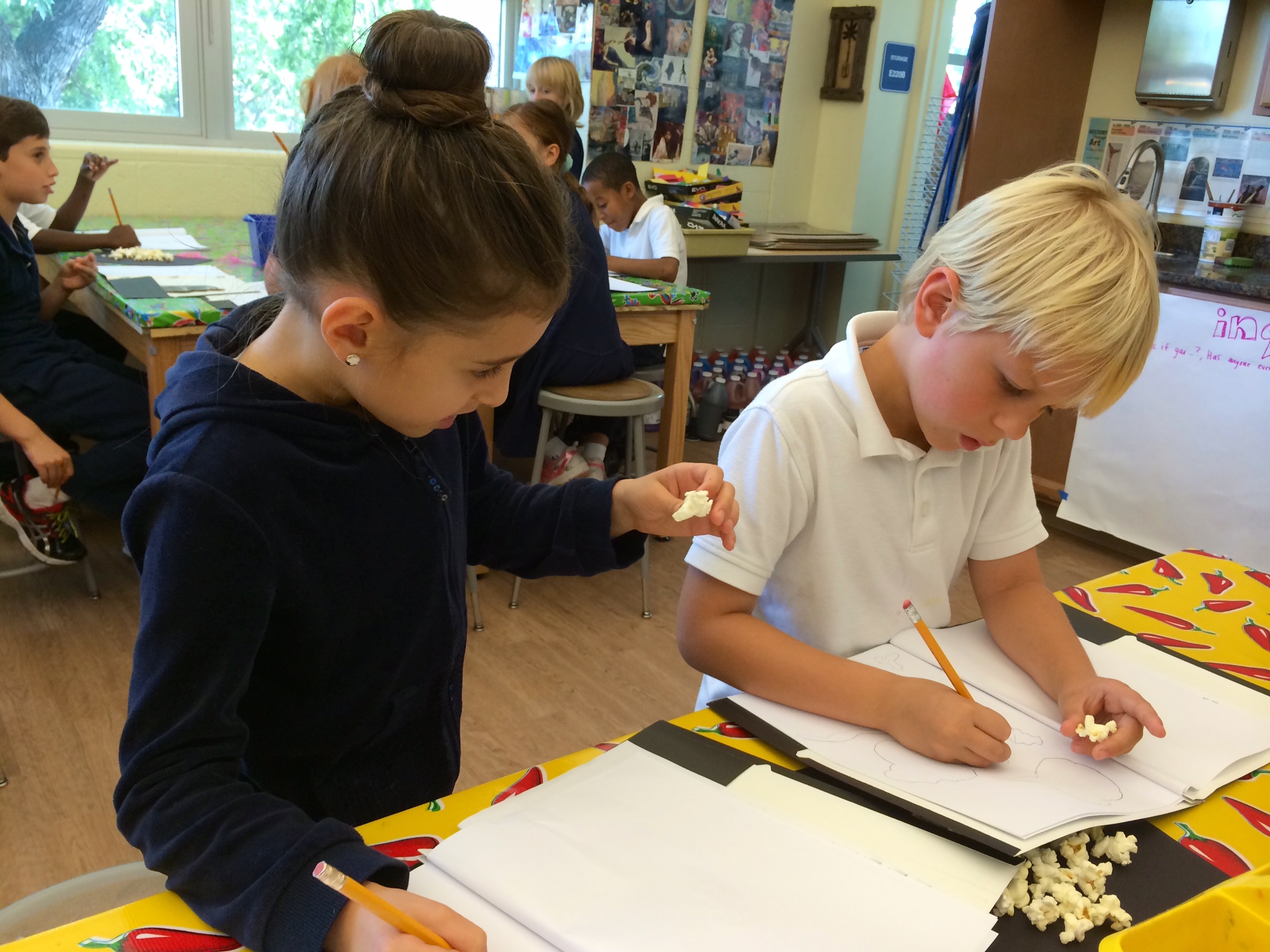Of course, there was plenty of snacking happening in the studio too, as well as some really fantastic organization of their observational drawings. Students came up with neat charts to keep track of their contour (outline) drawings, continuous line drawings (drawing without lifting the pencil off the paper), and blind-contour line drawings (drawing the object without looking at the paper).