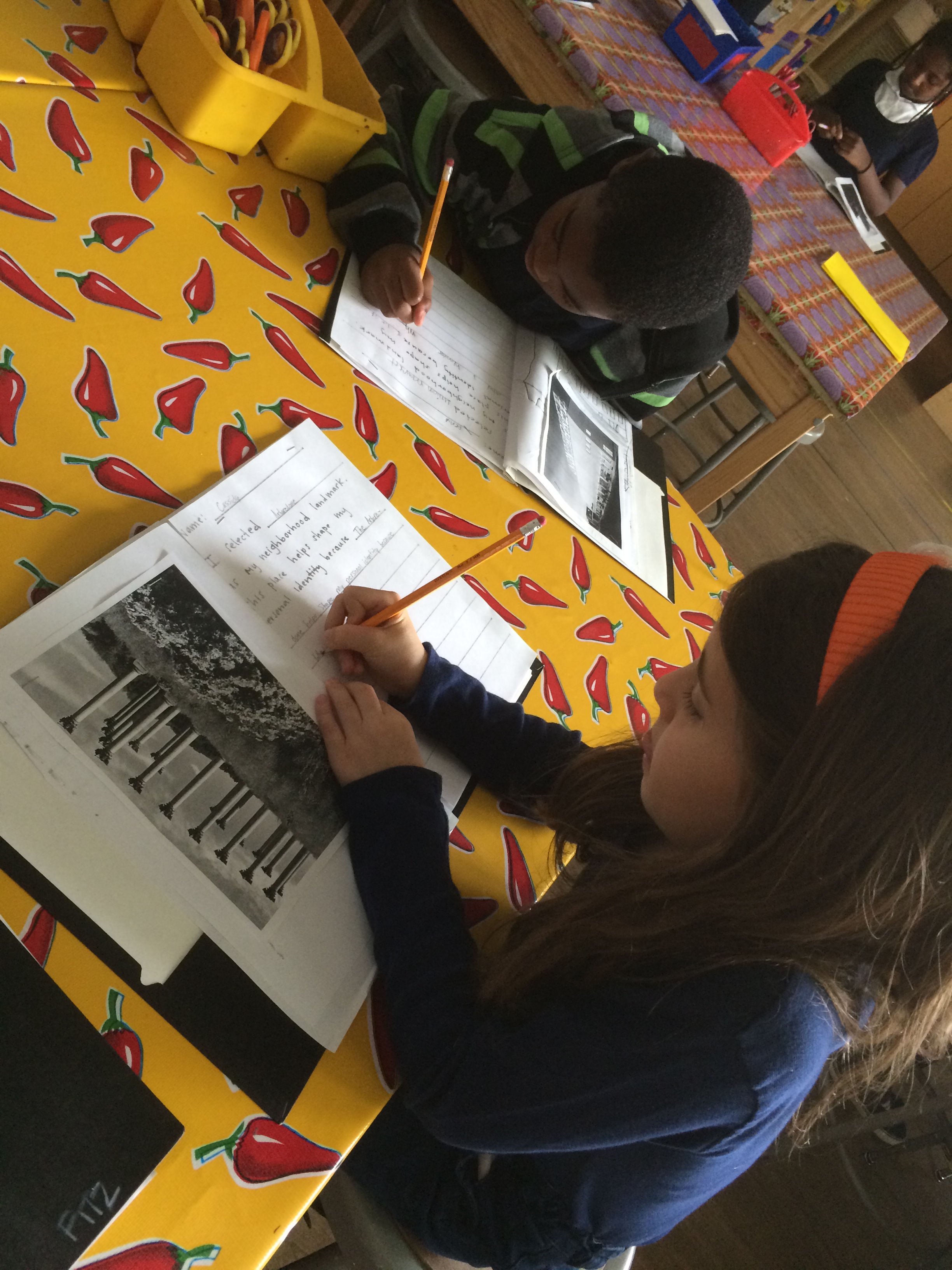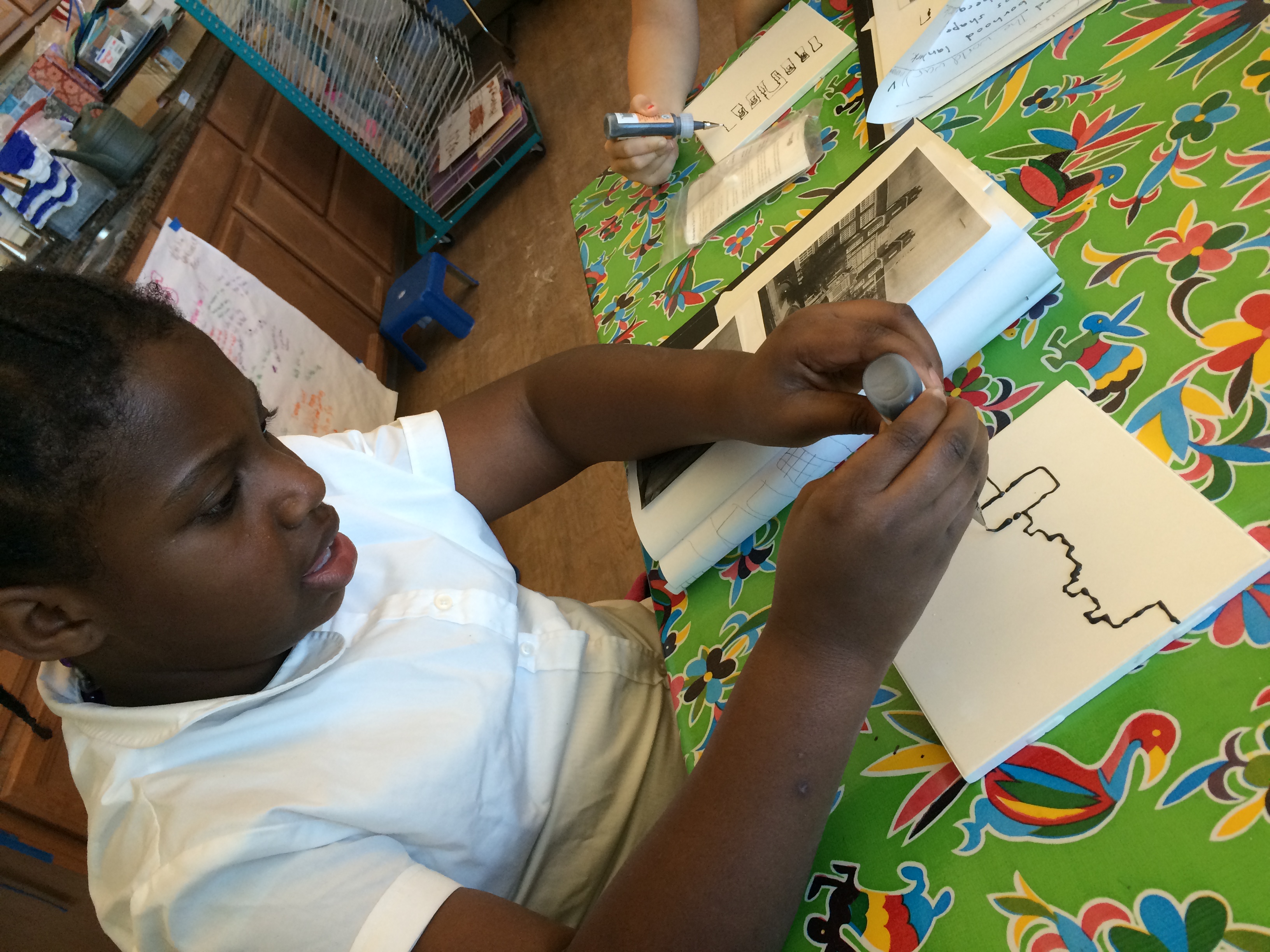 In conclusion, students transferred their observational drawing skills to a new media, made possible by our generous donorschoose.org patrons, and drew their neighborhood identity landmark in liquid clay called slip, on ceramic tiles. The decision to create these works of art in black and white instead of with color, creates a strong contrast that forces the viewer to play closer attention to the subject of the work and the process through which it was created.The finished art will be coated with a layer of clear glaze and fired in our kiln. They will depict simple, yet accurate, representations of a place that means something special to them and their families.