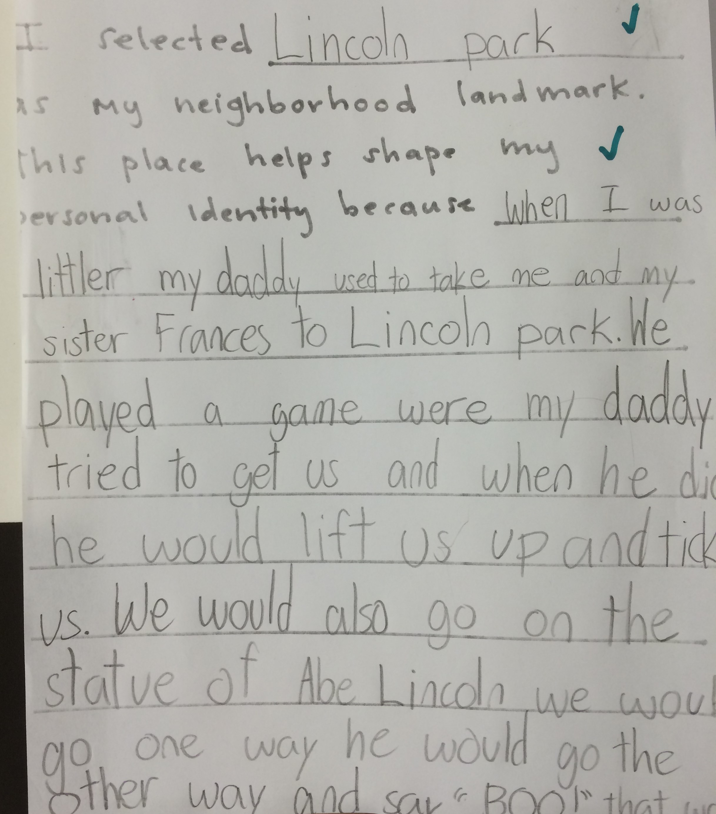 Then, we did something professional artists and art students do when displaying their work for the public. We created artist statements to accompany our work. An artist statement is text that gives the viewer further insight into the artwork on display. In our case, our artist statements clued the viewer in on how the neighborhood landmark chosen has influenced aspects of the student’s personal identity. Adding a written component to our art making helped students flush out their ideas and strengthen the meaning behind their work. I was really moved to read about the fond memories students have shared with loved ones and friends at many of our iconic city landmarks. Some students had never even been to the landmark they selected, but aspired to, because the place held special meaning to their parents or relatives. I loved watching students attach meaning to their work. I am always glad when I get to express to students that art is not about making something beautiful, but more so about making something meaningful.
